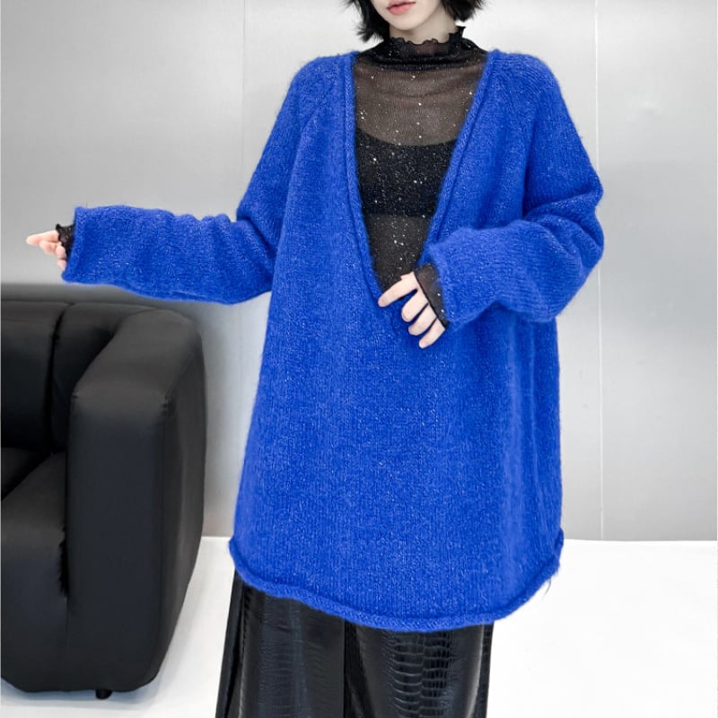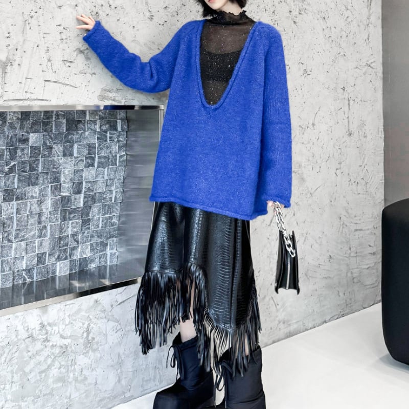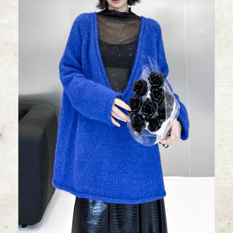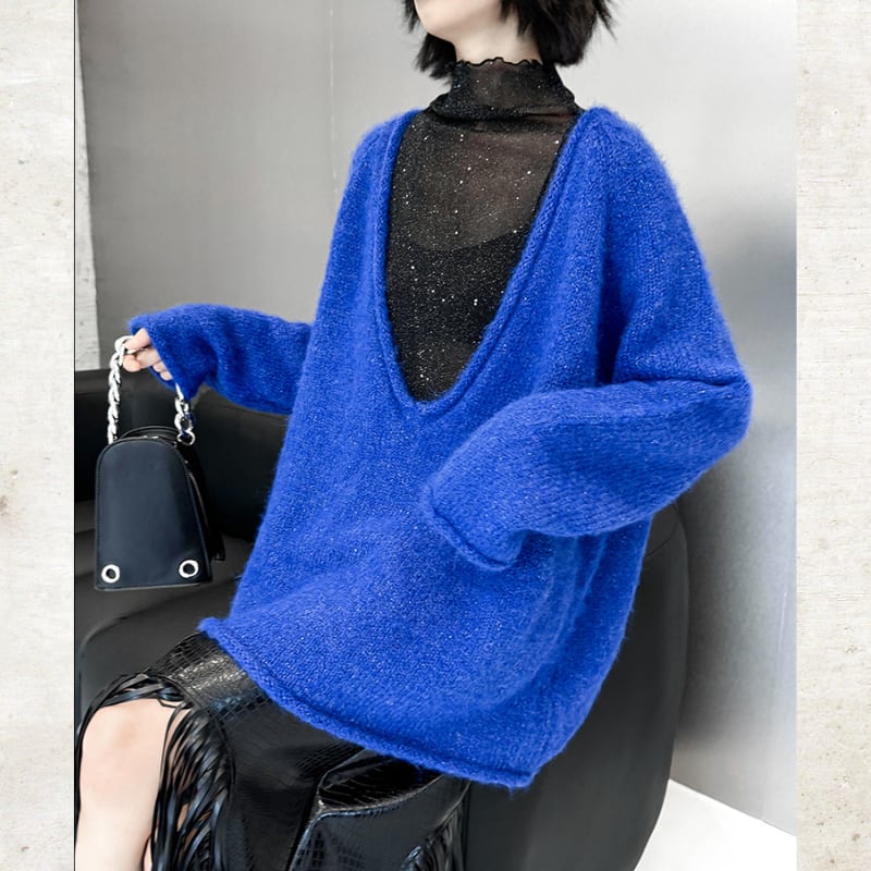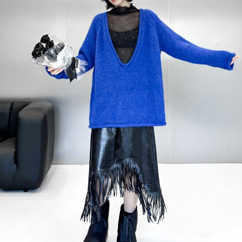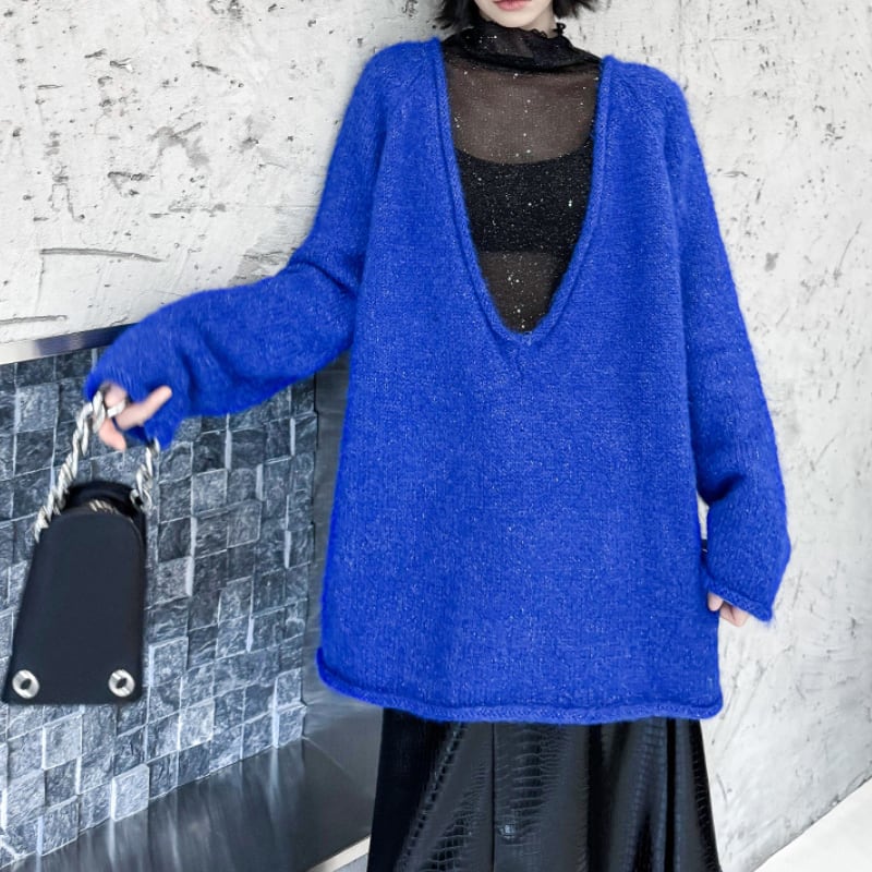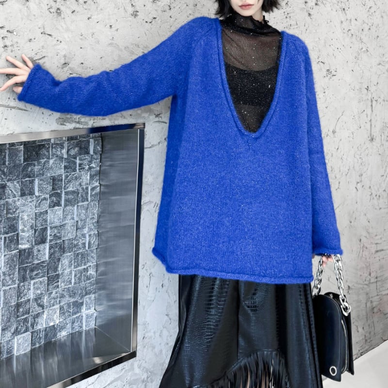 シャギーな素材と大胆に開いたディープVネックが特徴的なオーバーサイズニット。