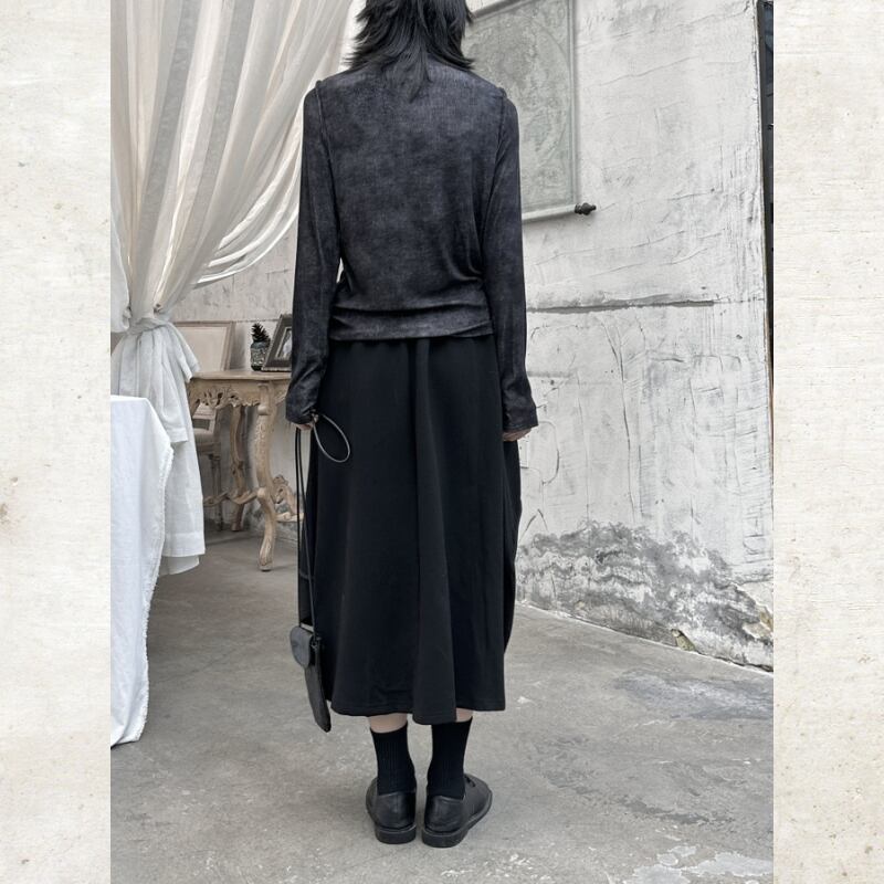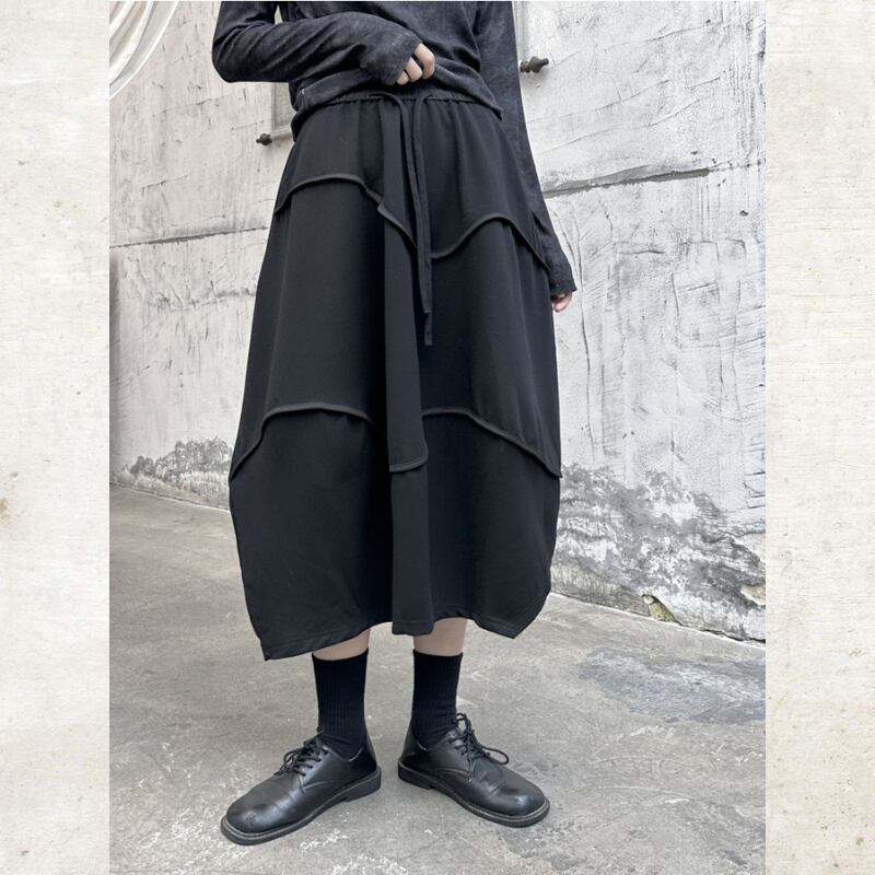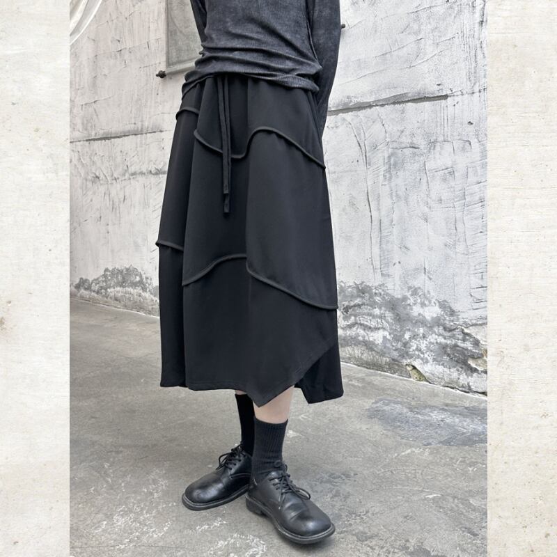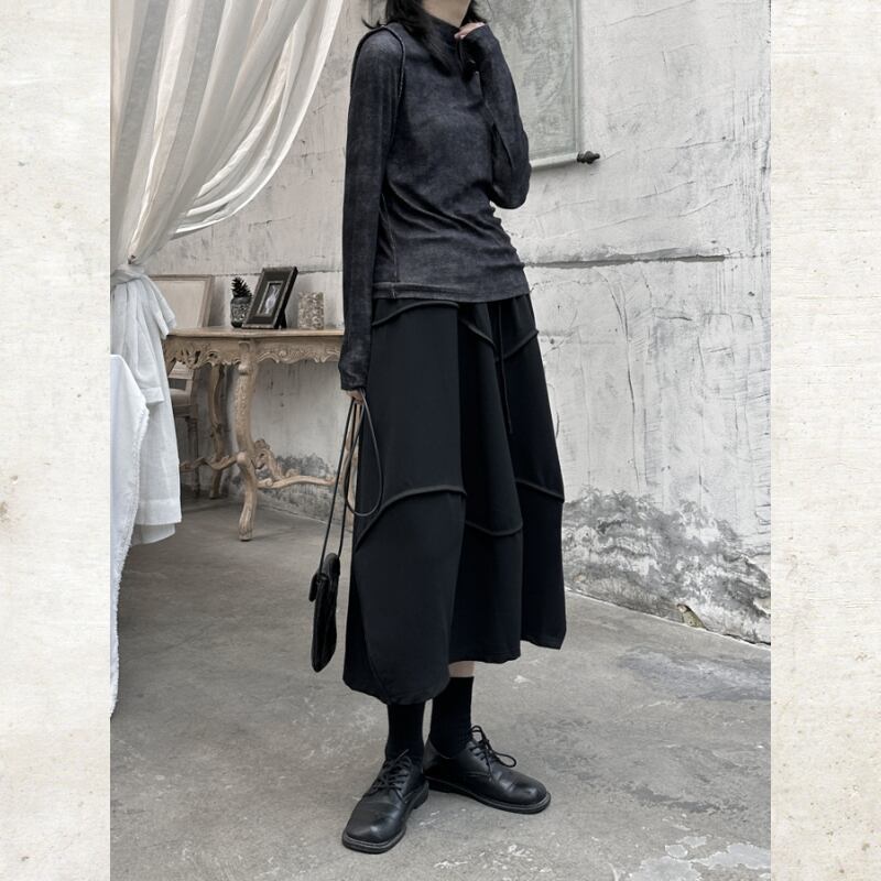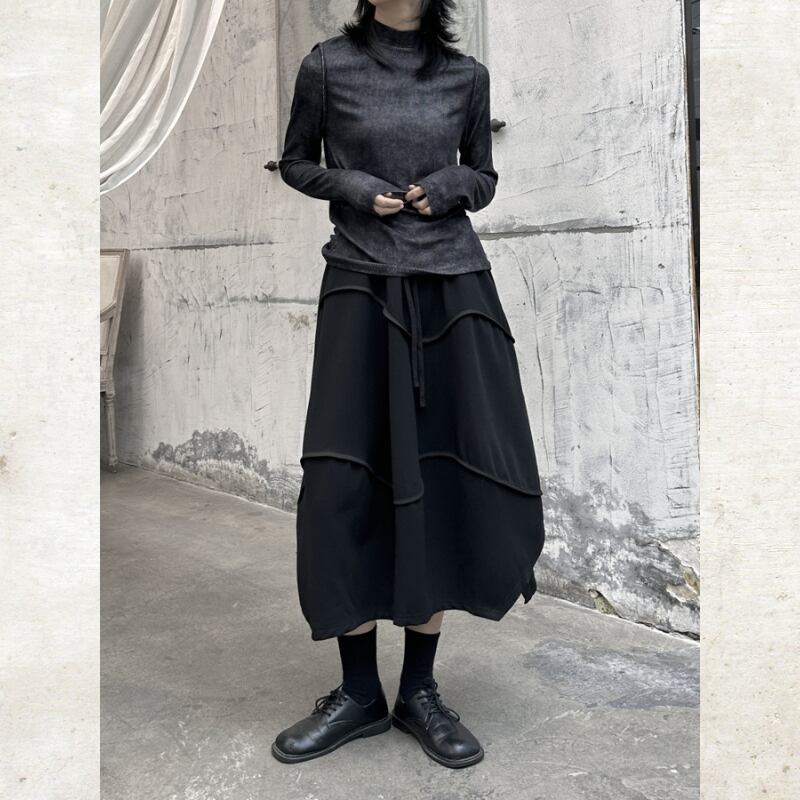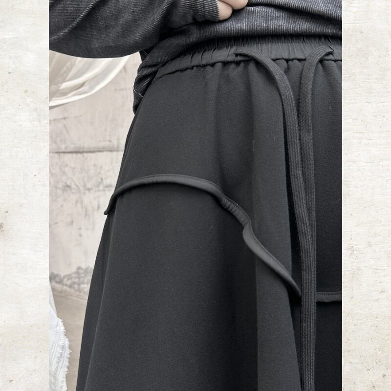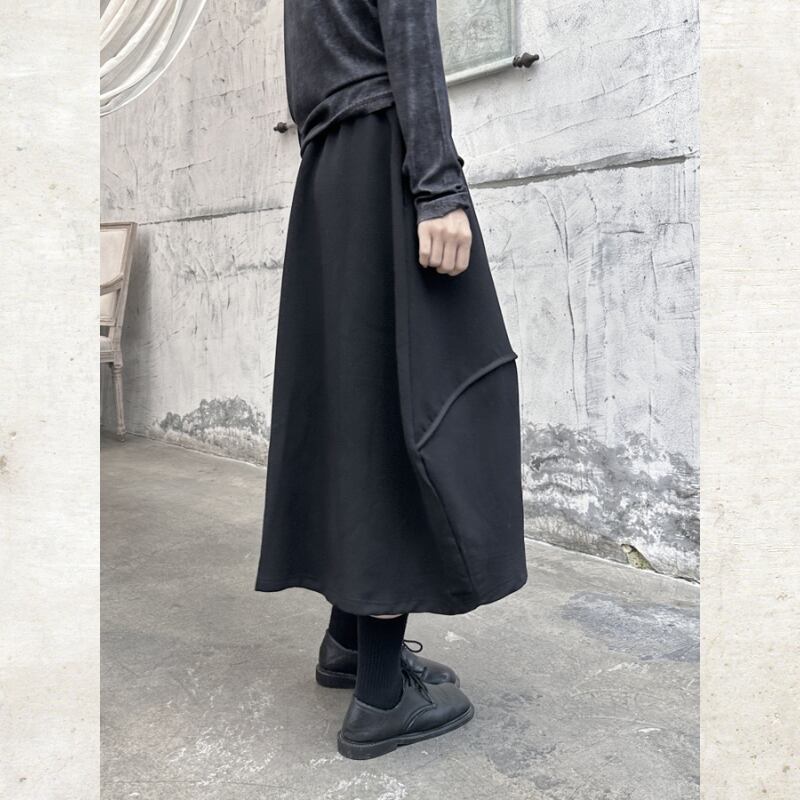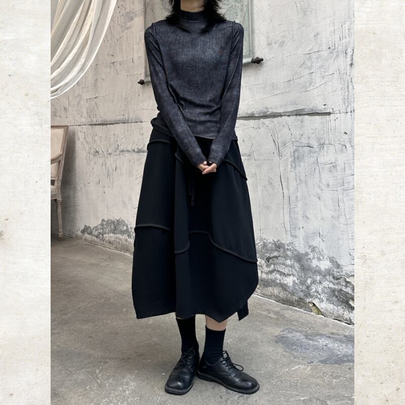 裾に向かって描かれるアシンメトリーなカーブの切り替えに、立体的なパイピングを効かせたデザインスカート。