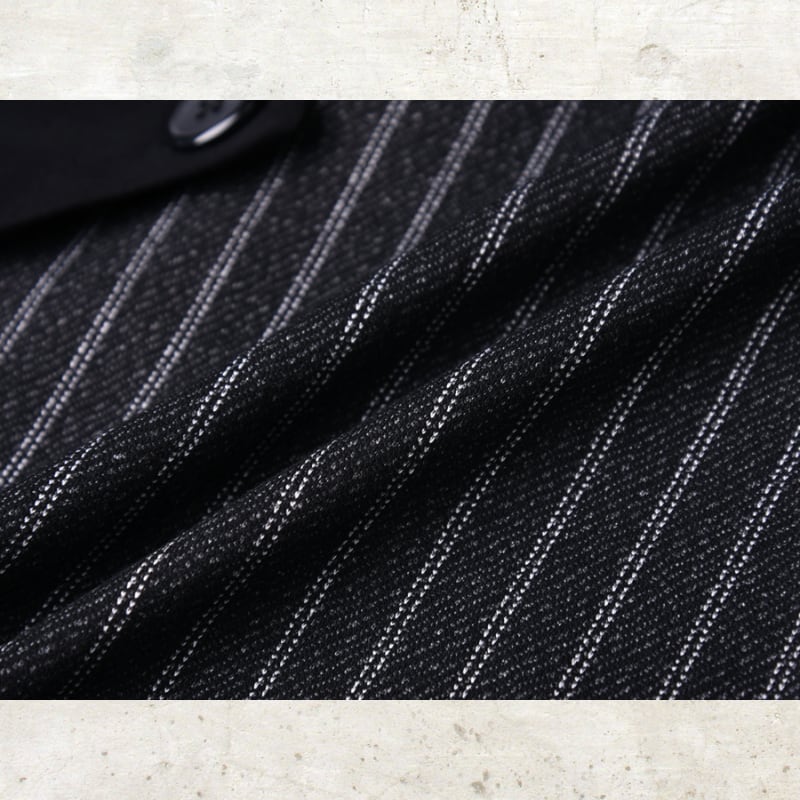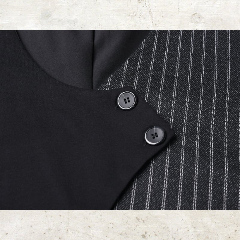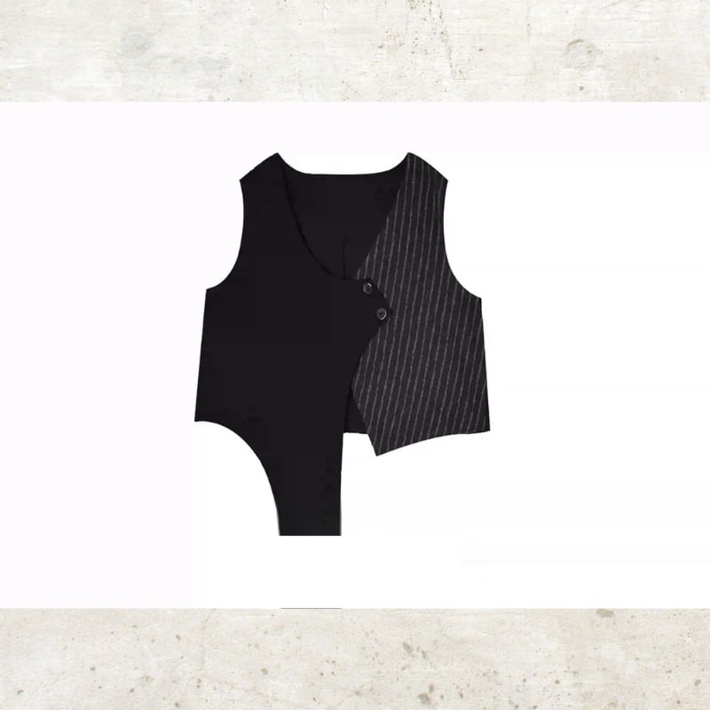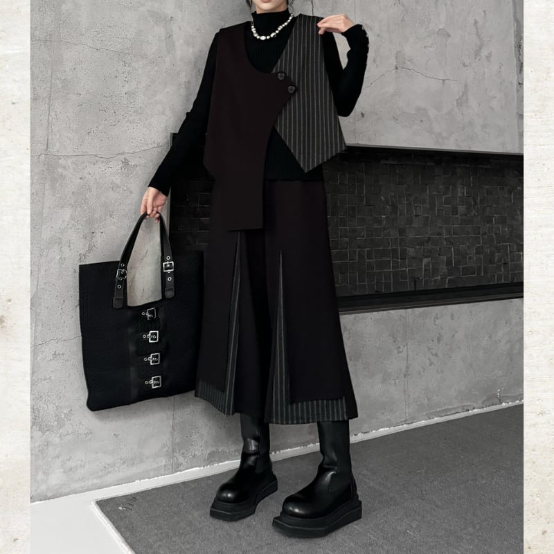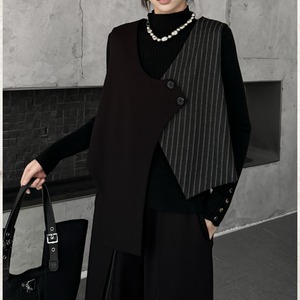 構築的なアシンメトリーカッティングと、ピンストライプ柄を組み合わせたノースリーブベスト。