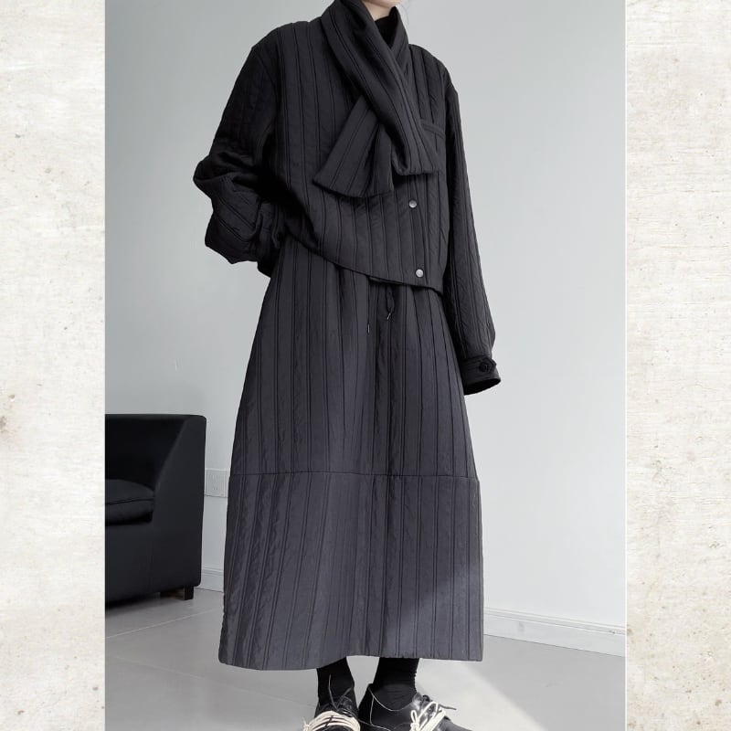 同素材のマフラーが付属し、セットアップのように楽しめる洗練されたウィンターアウターです。