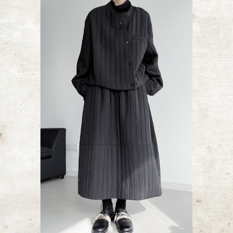 中綿入りの素材ながらもノーカラーのミニマルなデザインとショート丈で、重さを感じさせない軽快なルックを実現。