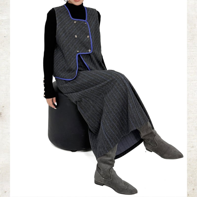 ベストはダブルブレスト風の飾りボタンとショート丈で、洗練されたバランスを演出。
