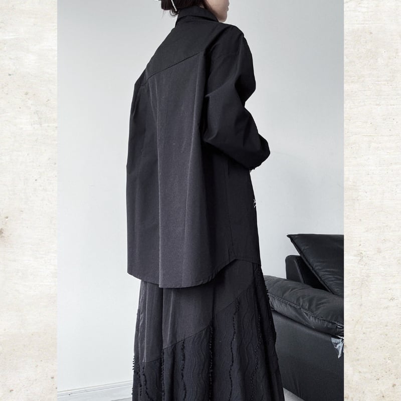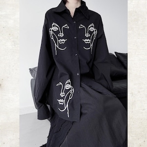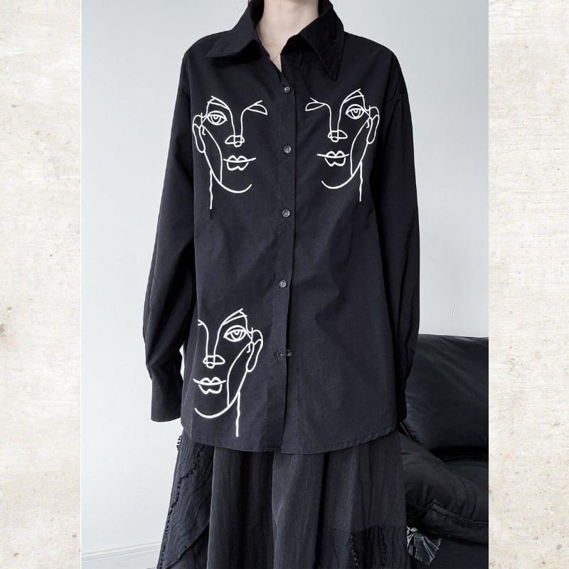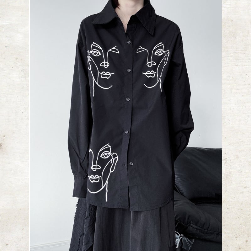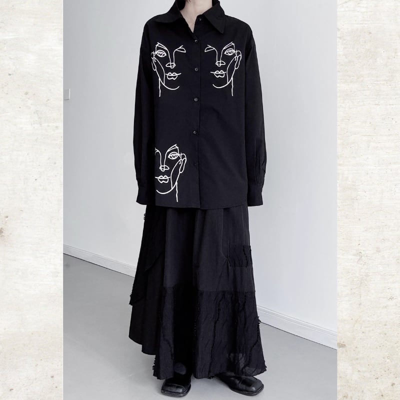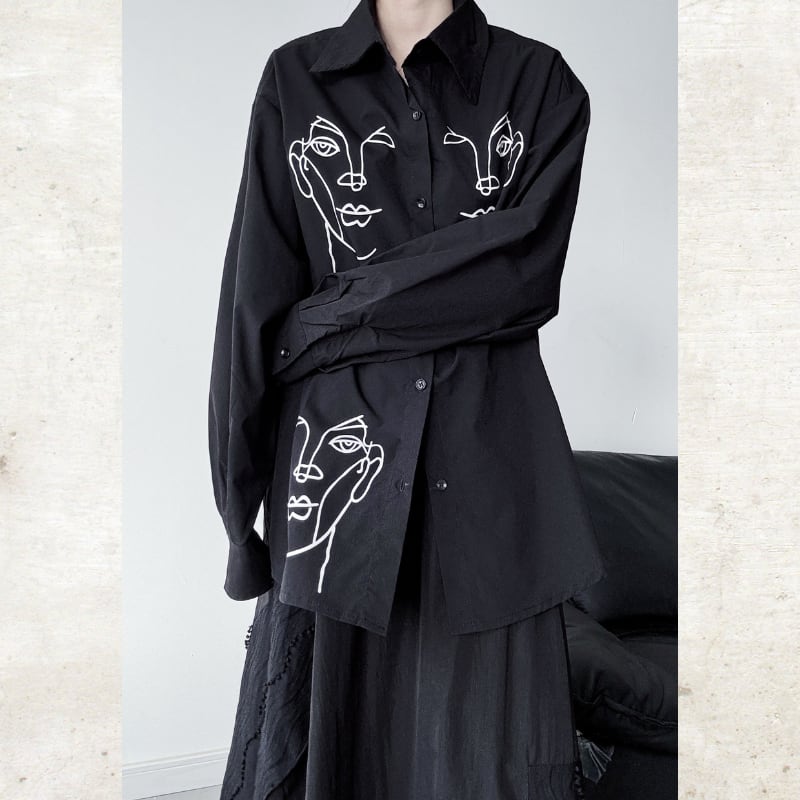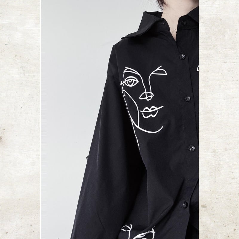 オーバーサイズのルーズシルエットに、抽象的なフェイスラインのアートを施したモードなシャツ。