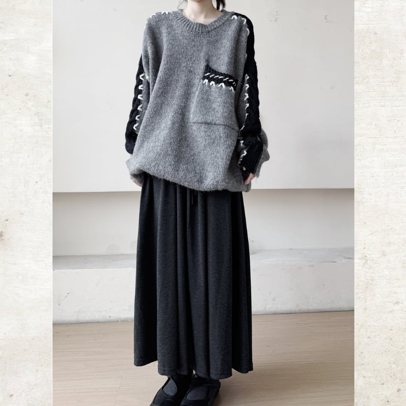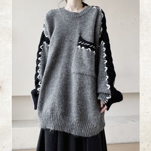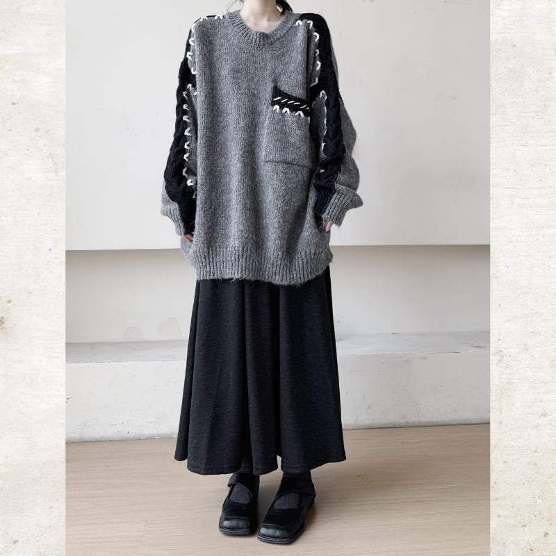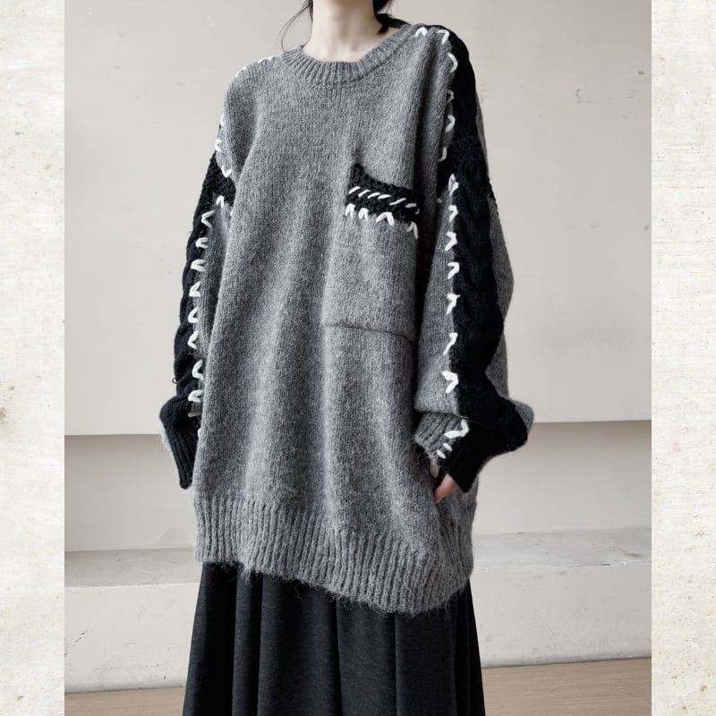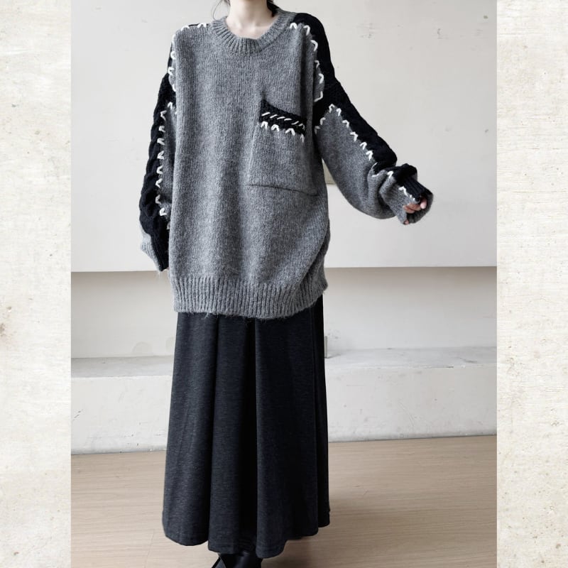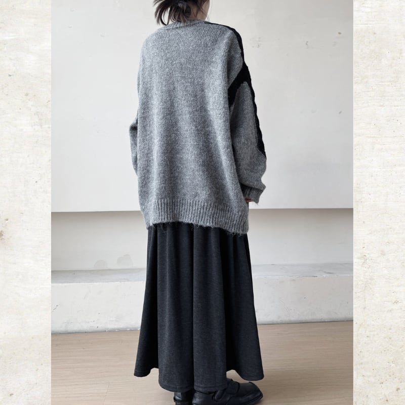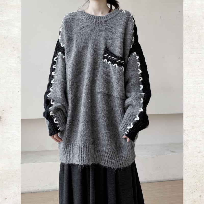 オーバーサイズのルーズなシルエットに、複数のテクスチャーを組み合わせたモードな切替ニット。