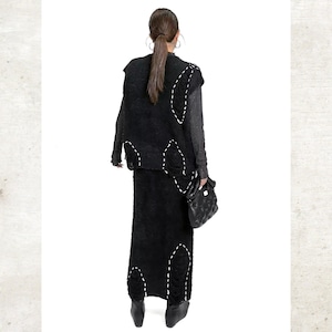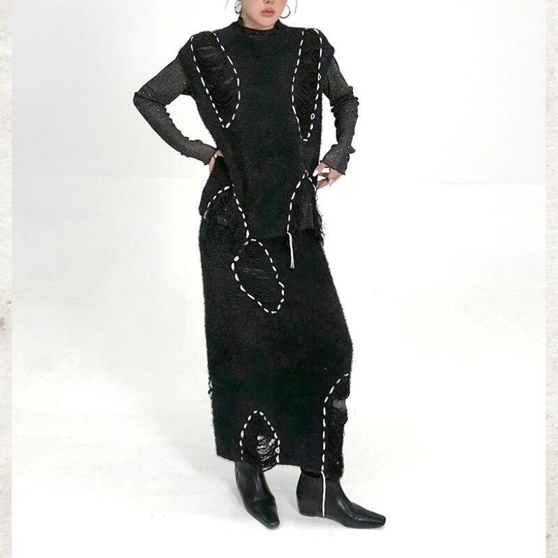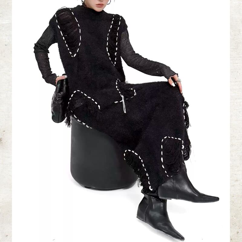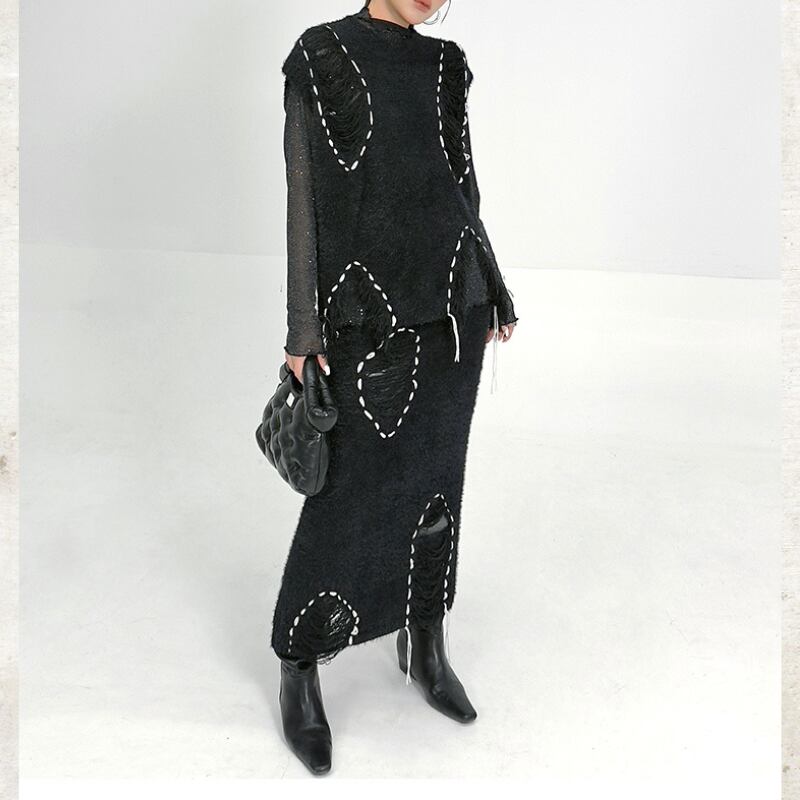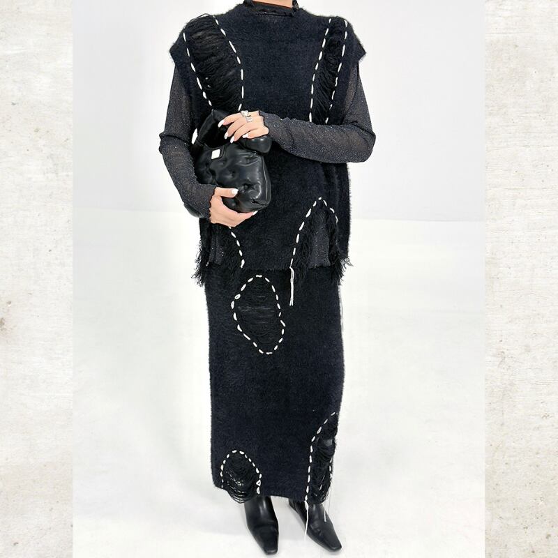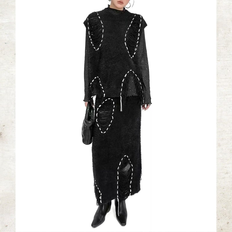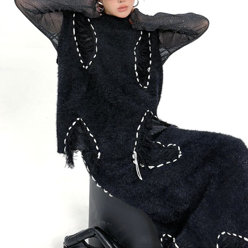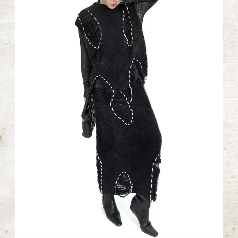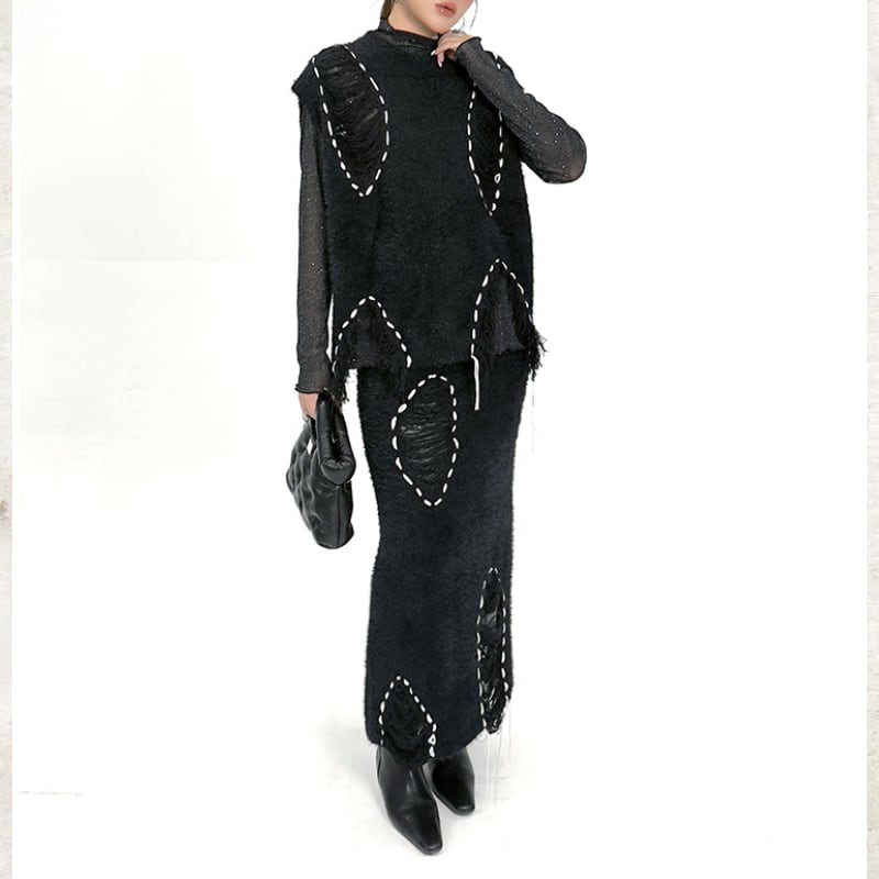 Damaged Shaggy Knit Vest & Skirt Set-up H0470
