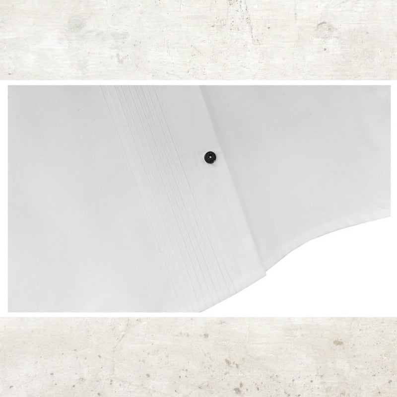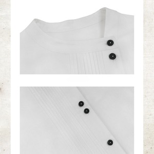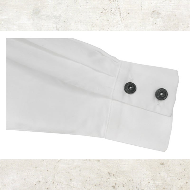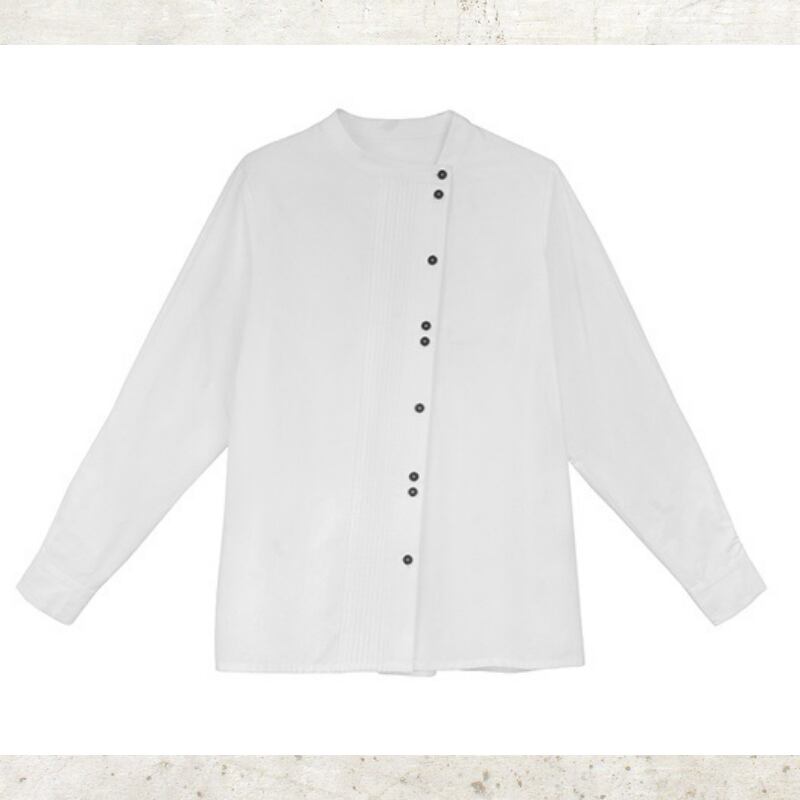 フロントの繊細なピンタックとアシンメトリーなボタンの並びが、クリーンな白シャツに構築的なデザイン性をプラス。