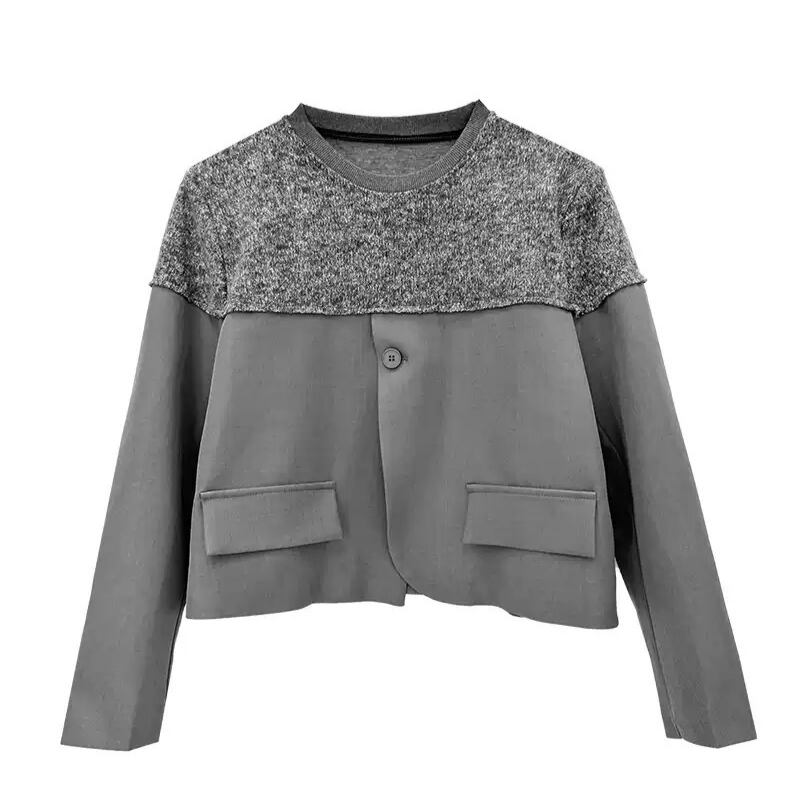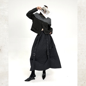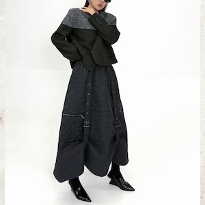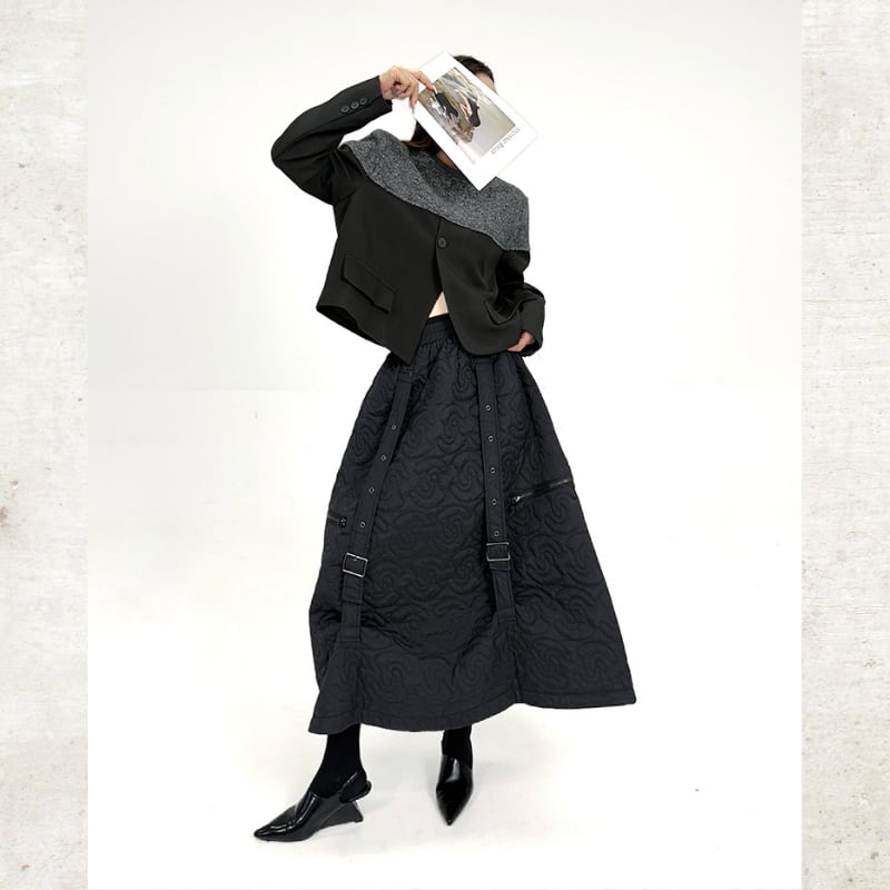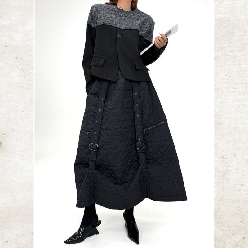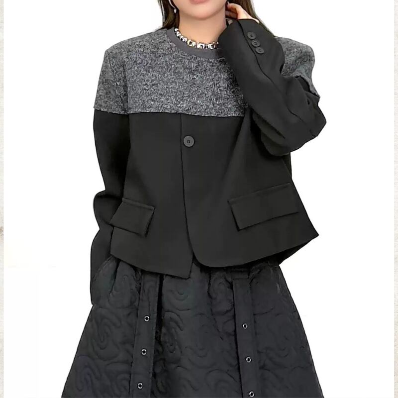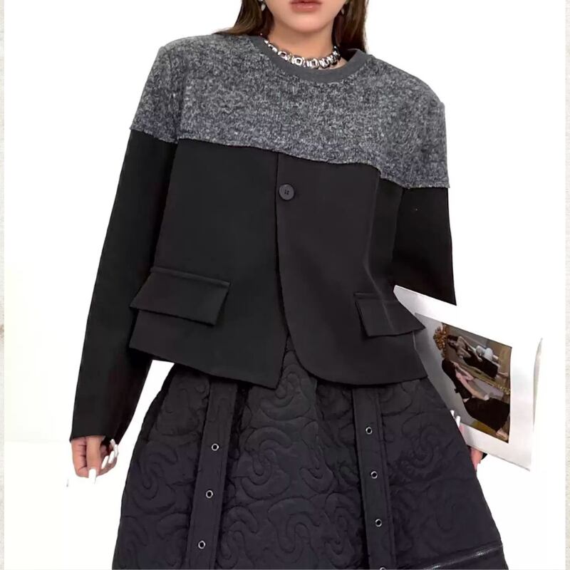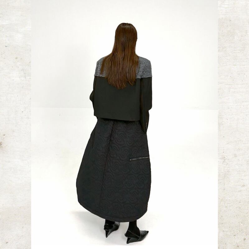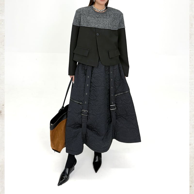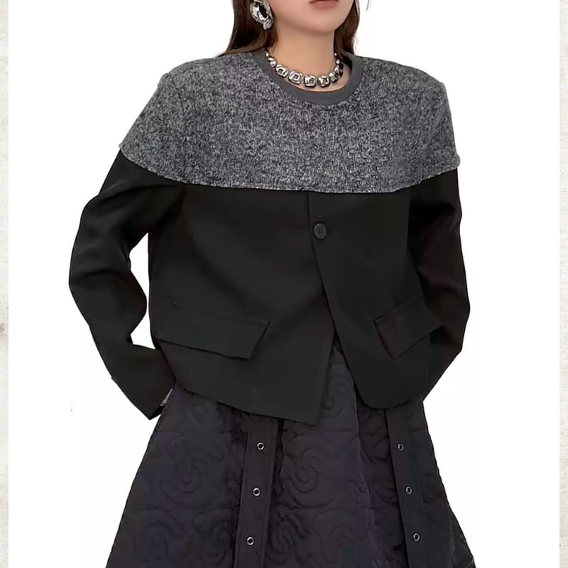 ニットが肩からデコルテを包み込み、身頃と袖が全体を引き締める構築的な切り替えデザインが魅力です。