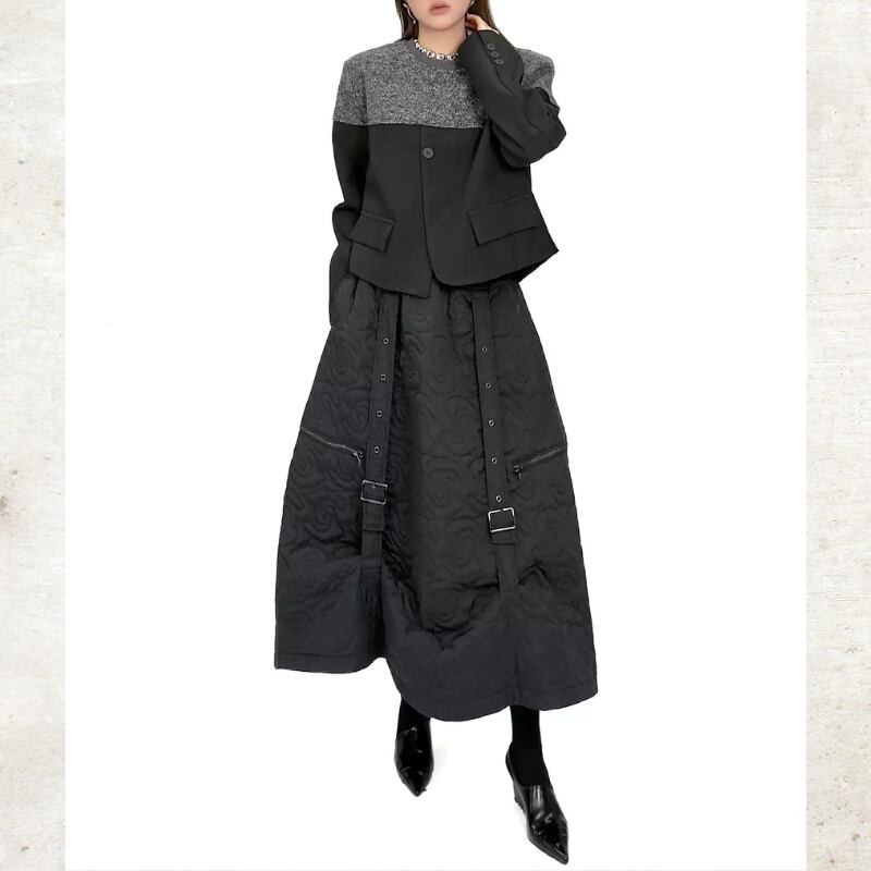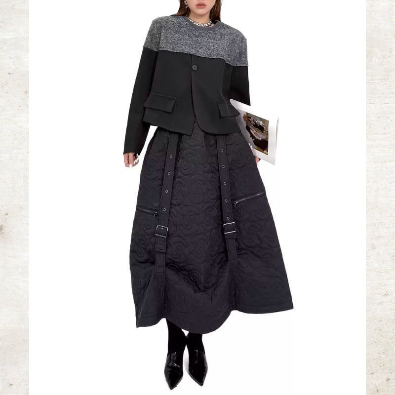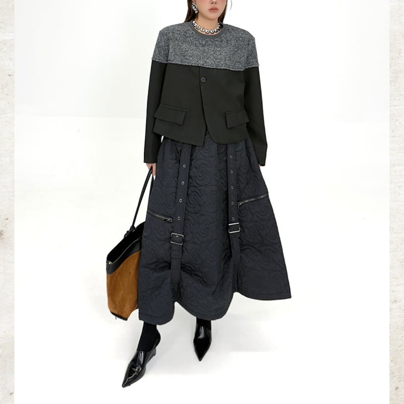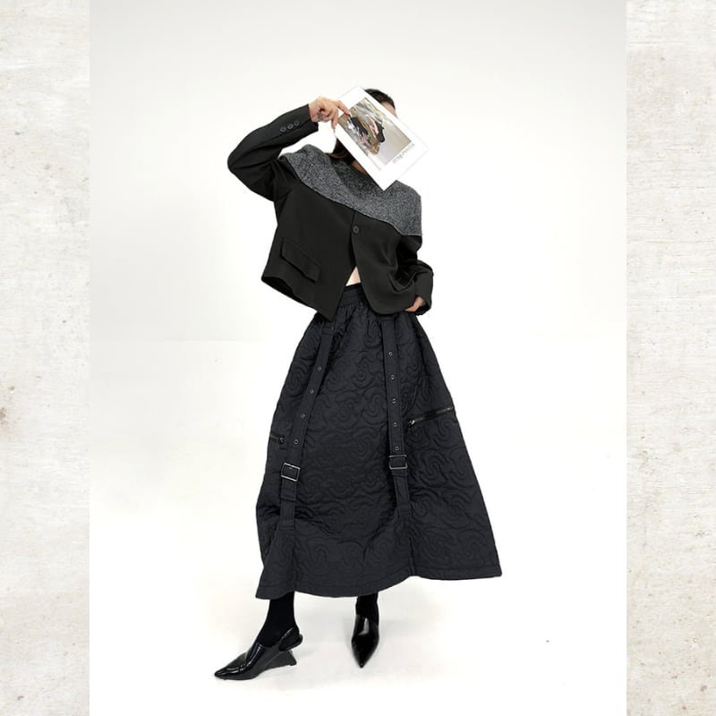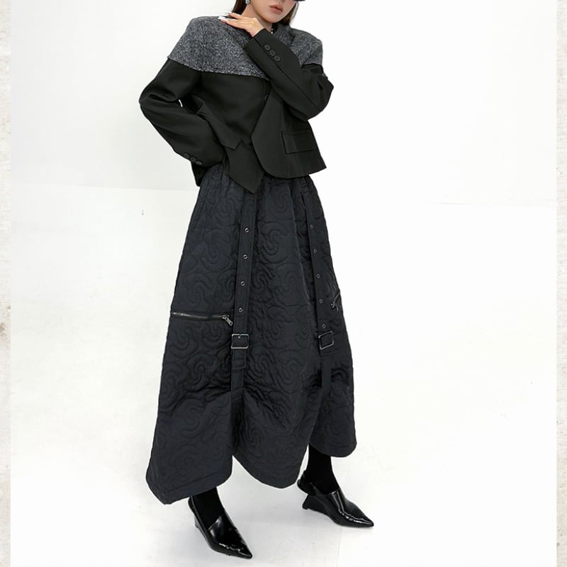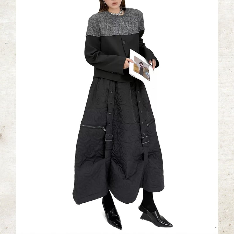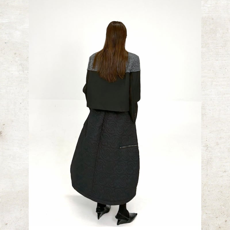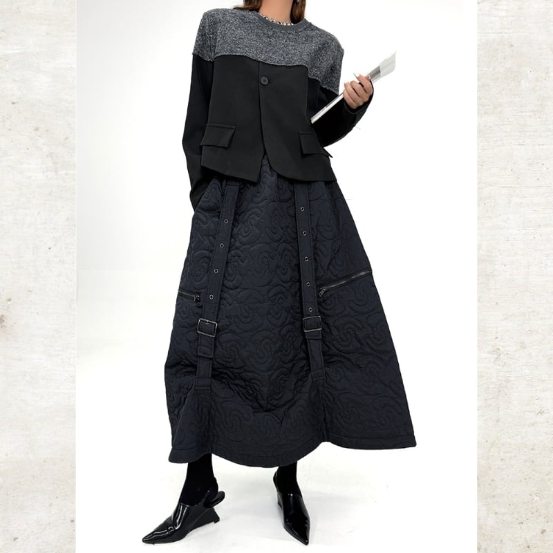 曲線を描くキルティングが、圧倒的な存在感を放つロングスカート。