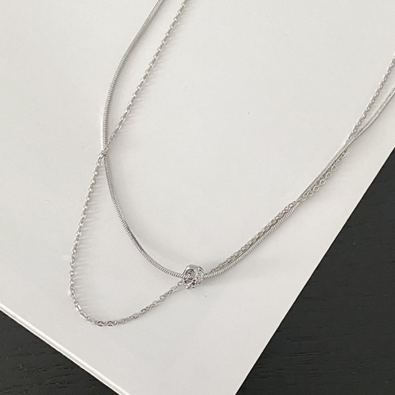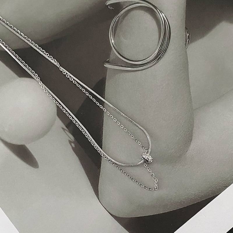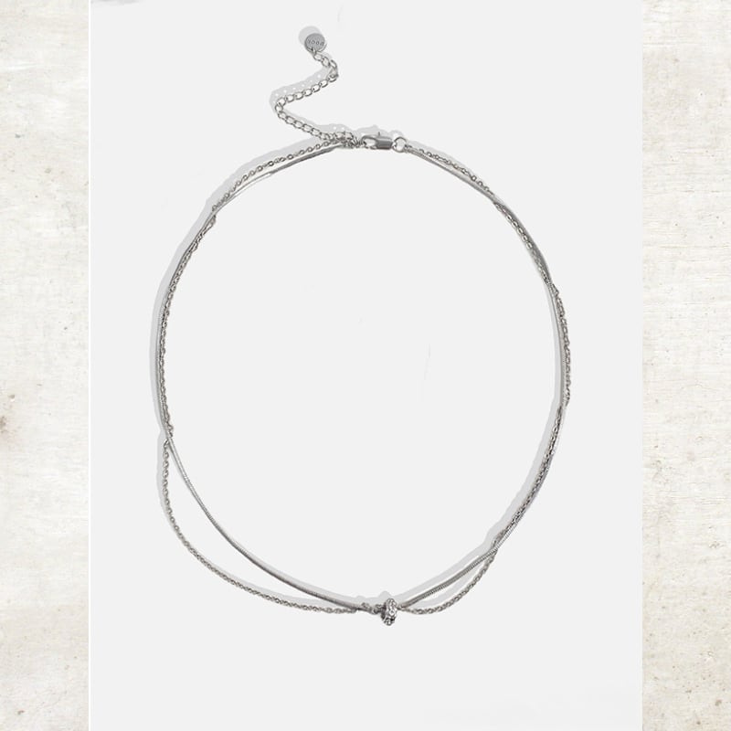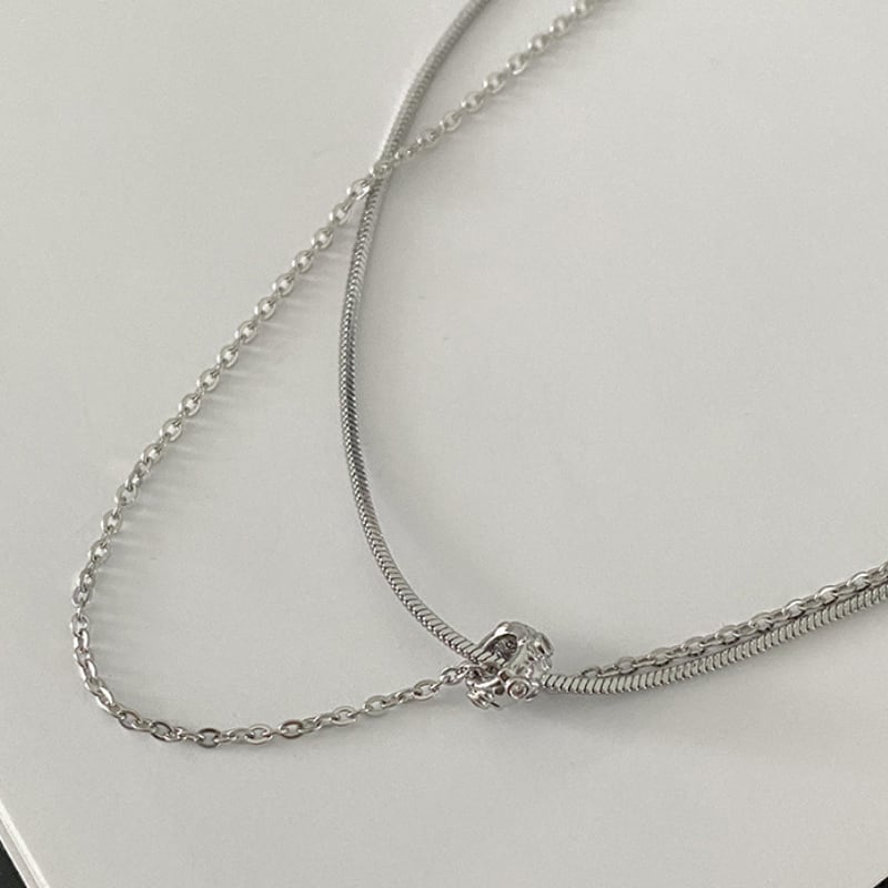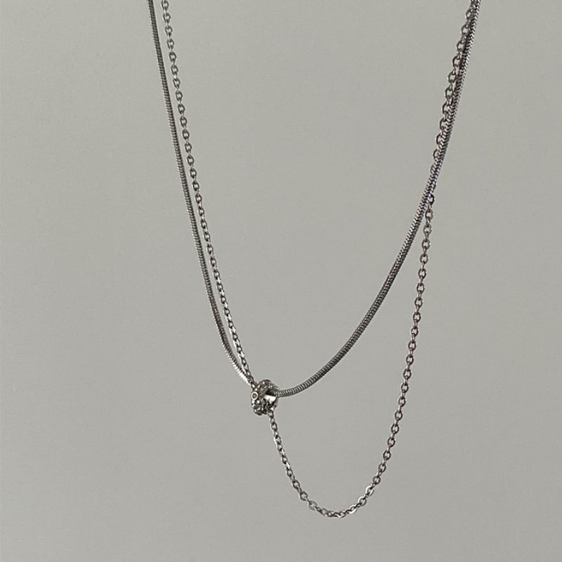 滑らかなスネークチェーンと、華奢な細チェーンを組み合わせた二連レイヤードデザイン。