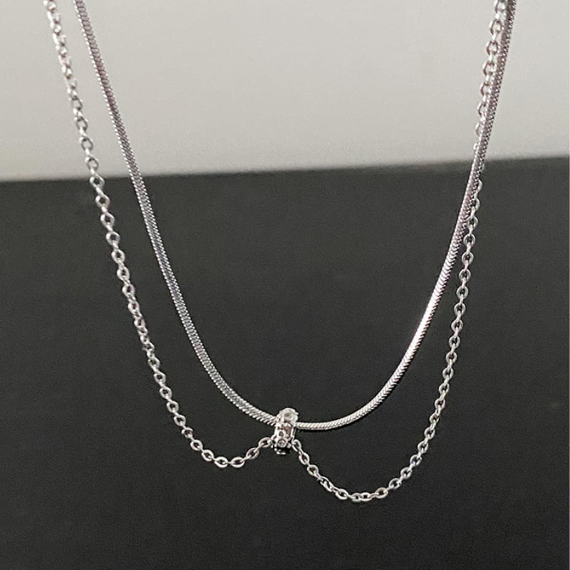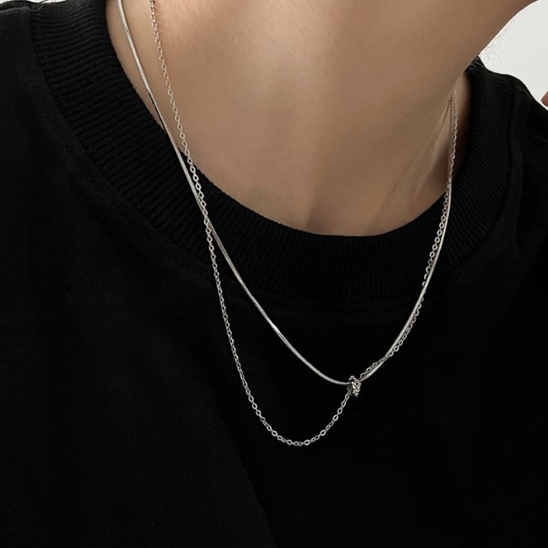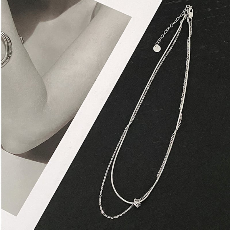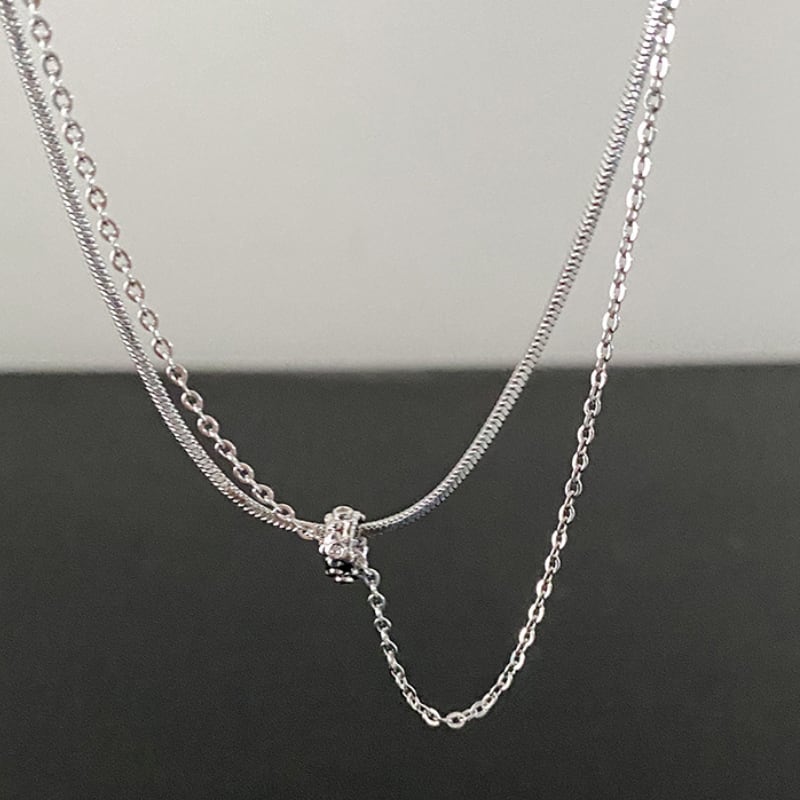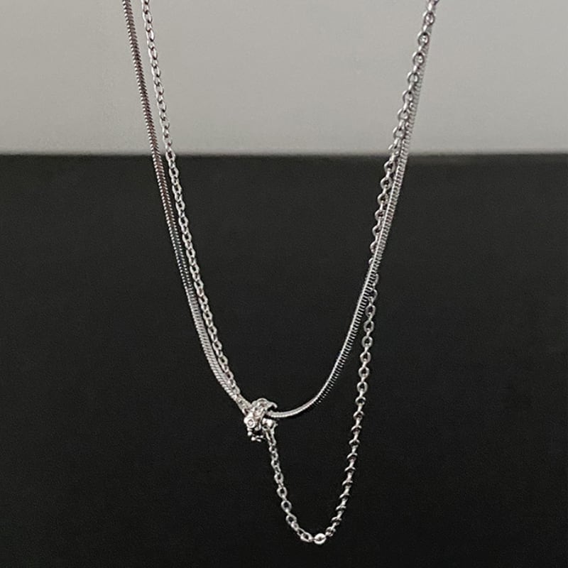 滑らかなスネークチェーンと、華奢な細チェーンを組み合わせた二連レイヤードデザイン。