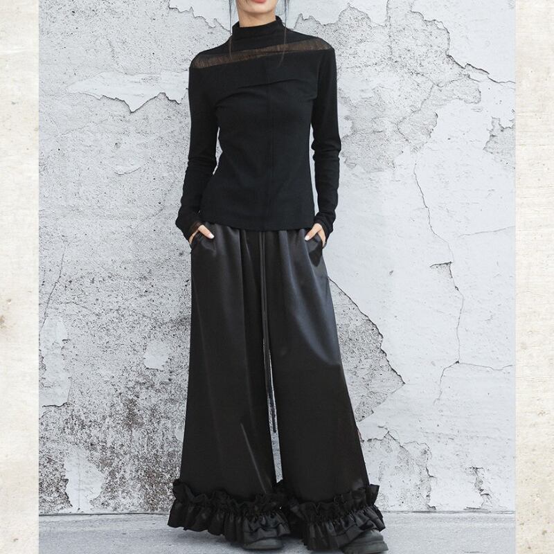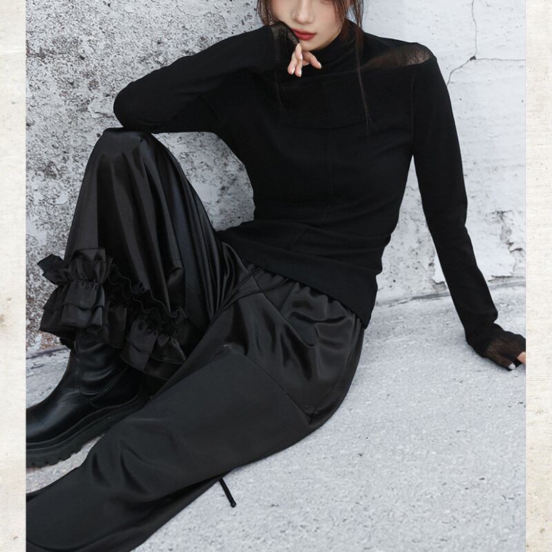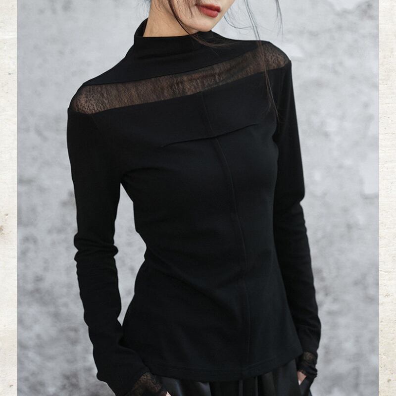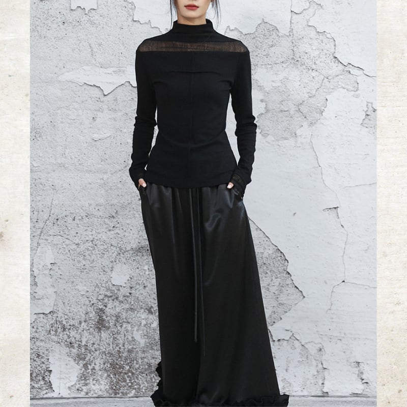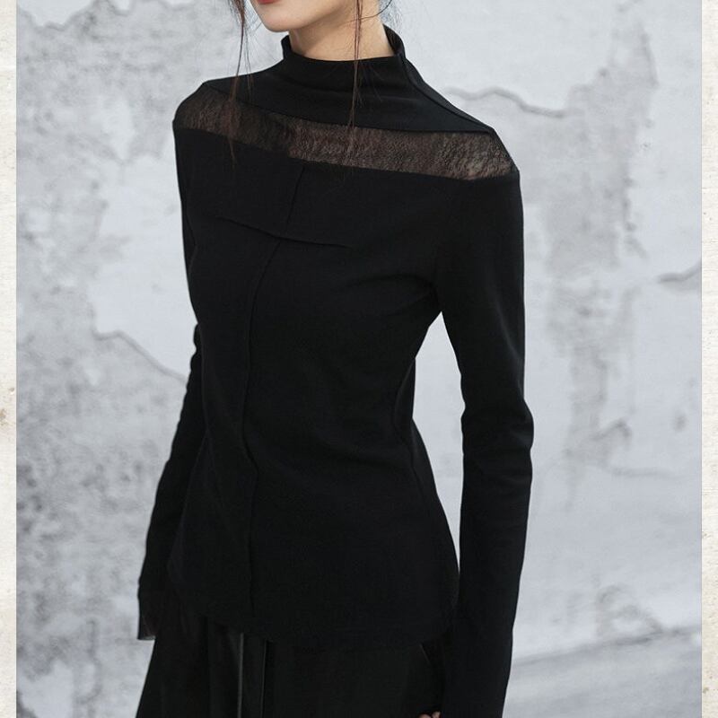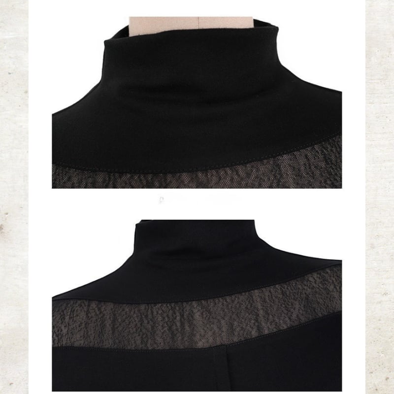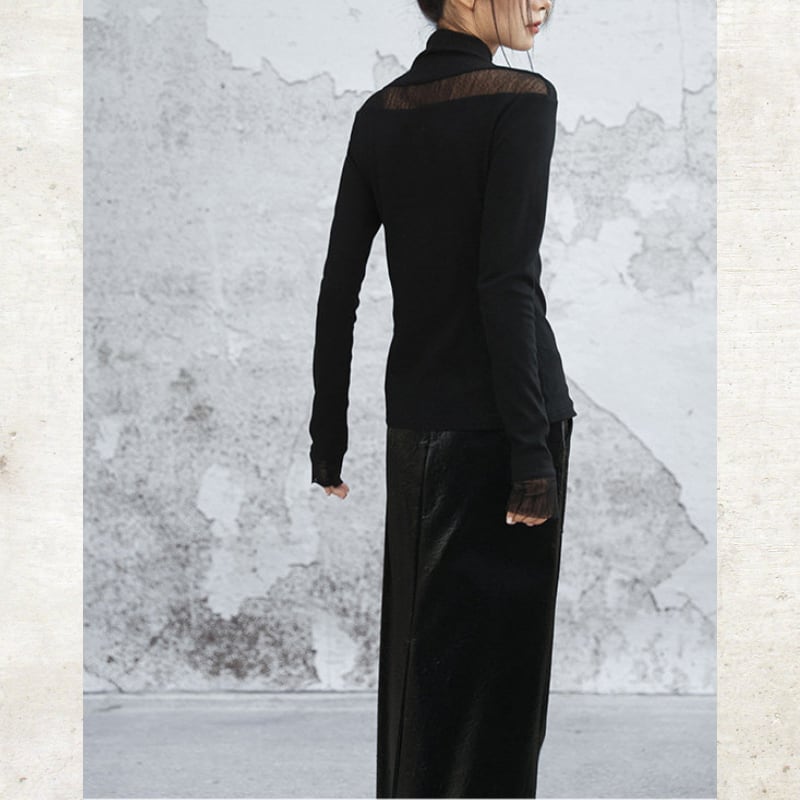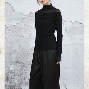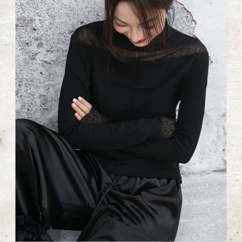 首元と袖口に配した繊細なシアー素材が、装いに軽やかな抜け感をもたらすハイネックトップス。