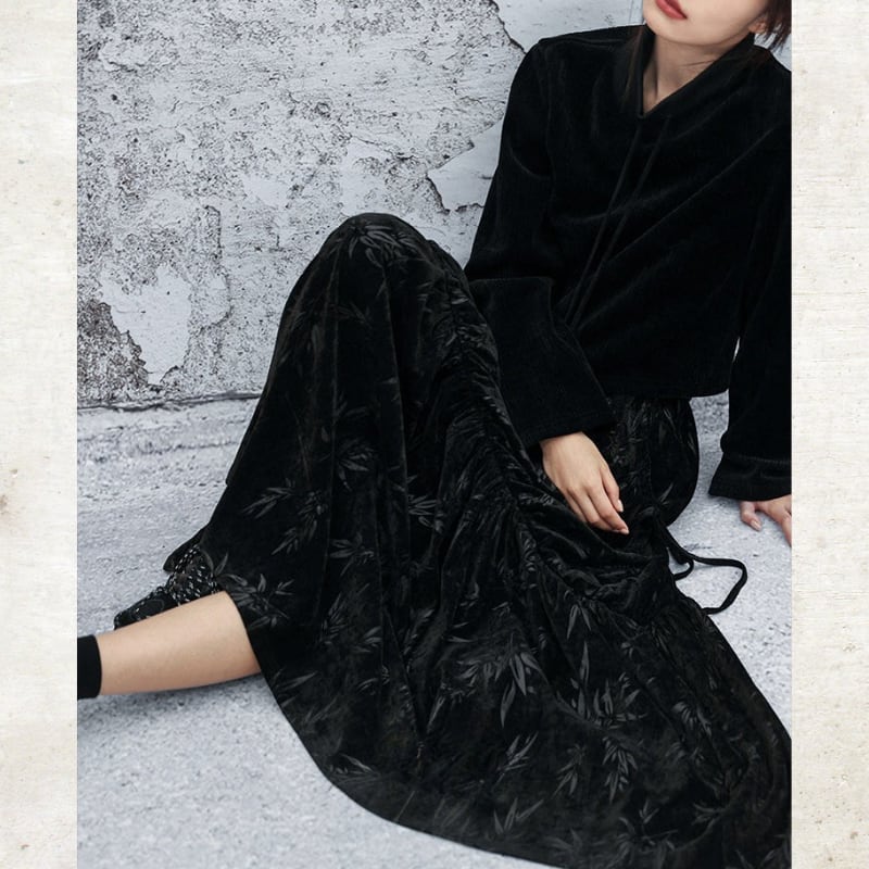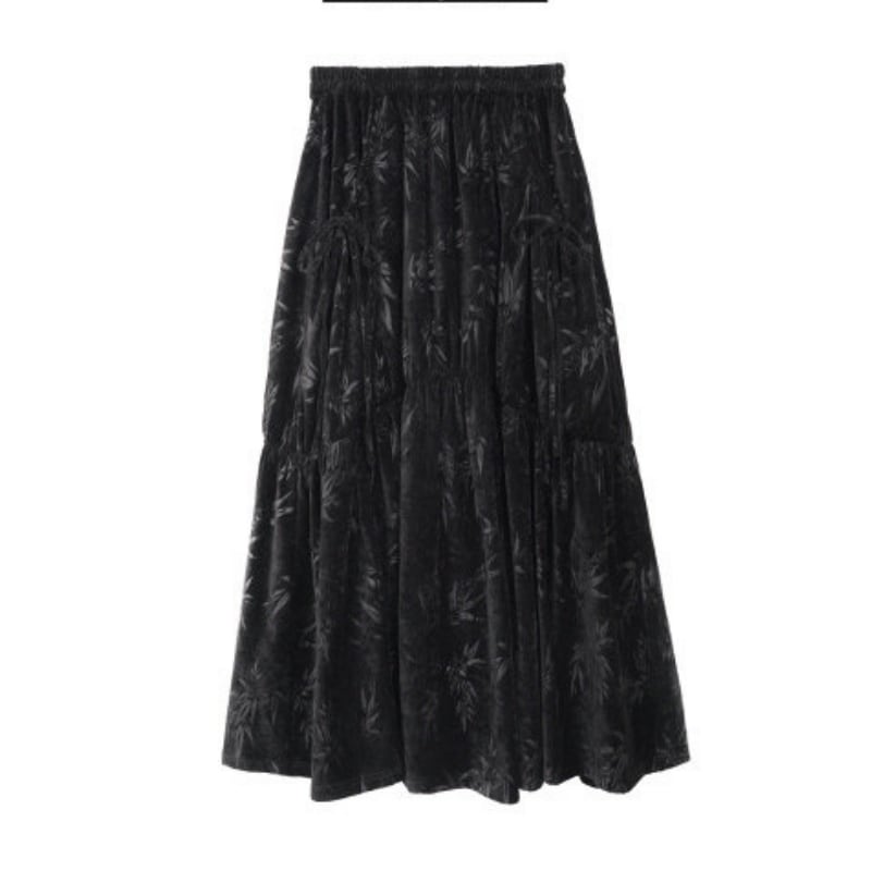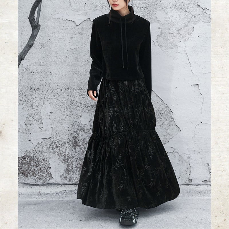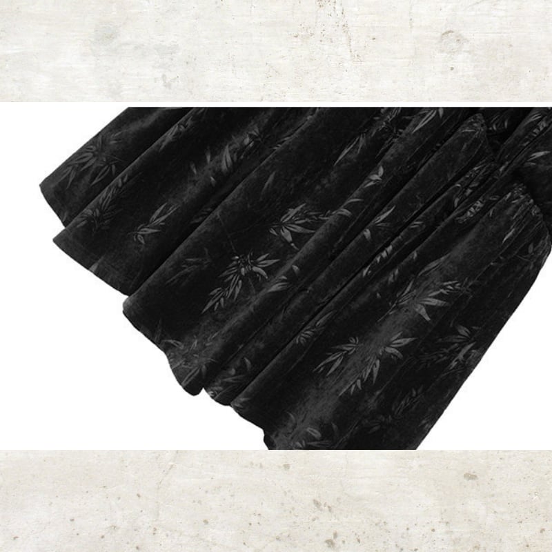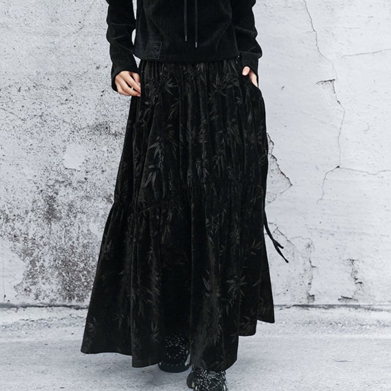 竹の葉を模した立体的なエンボス加工が、漆黒の生地に奥行きを与えるティアードスカート。