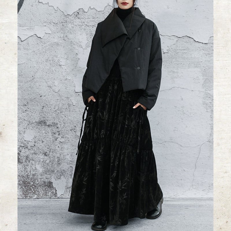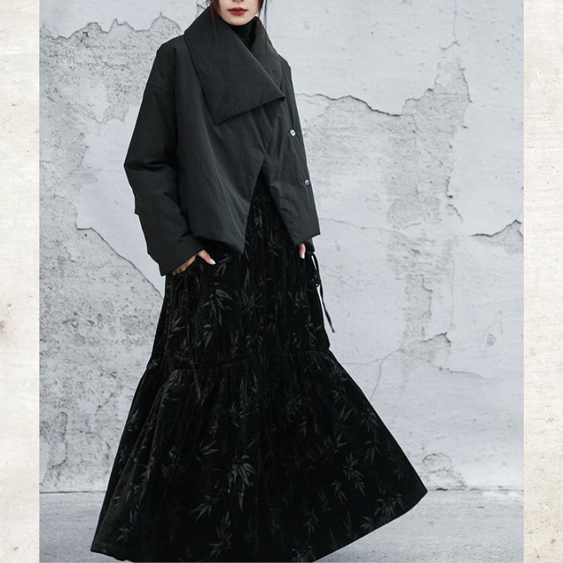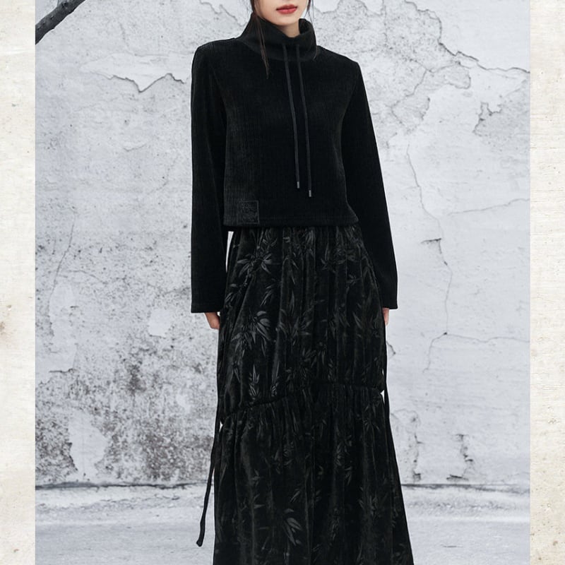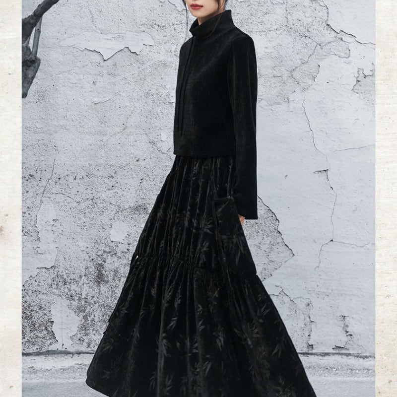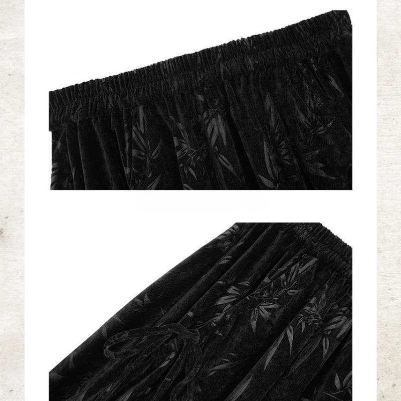 竹の葉を模した立体的なエンボス加工が、漆黒の生地に奥行きを与えるティアードスカート。