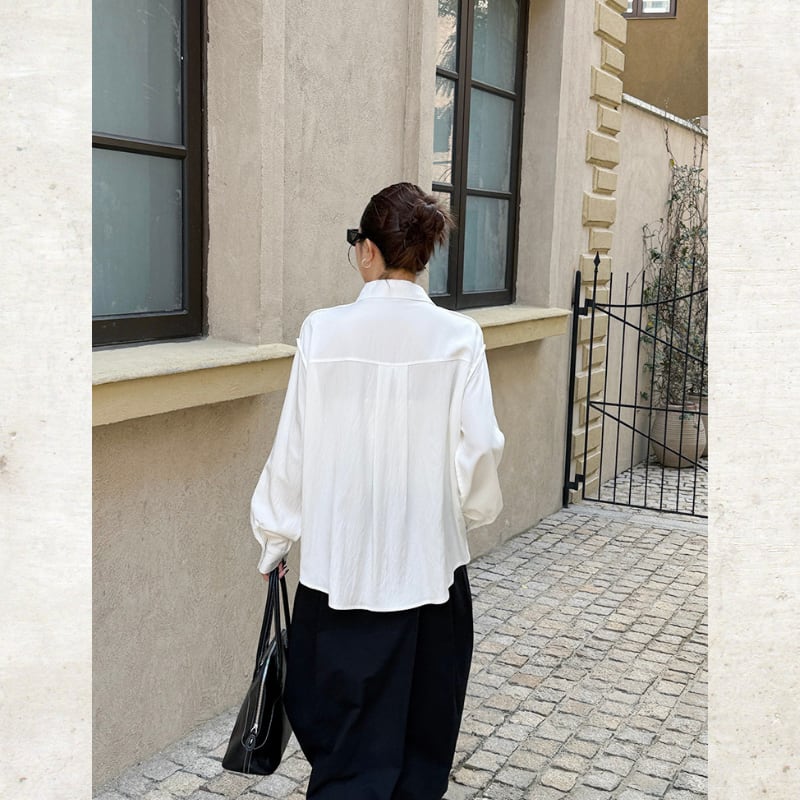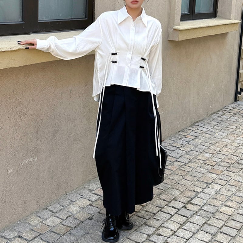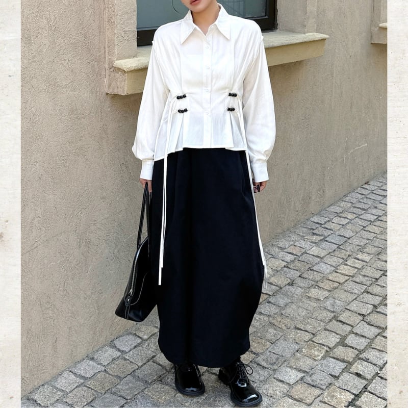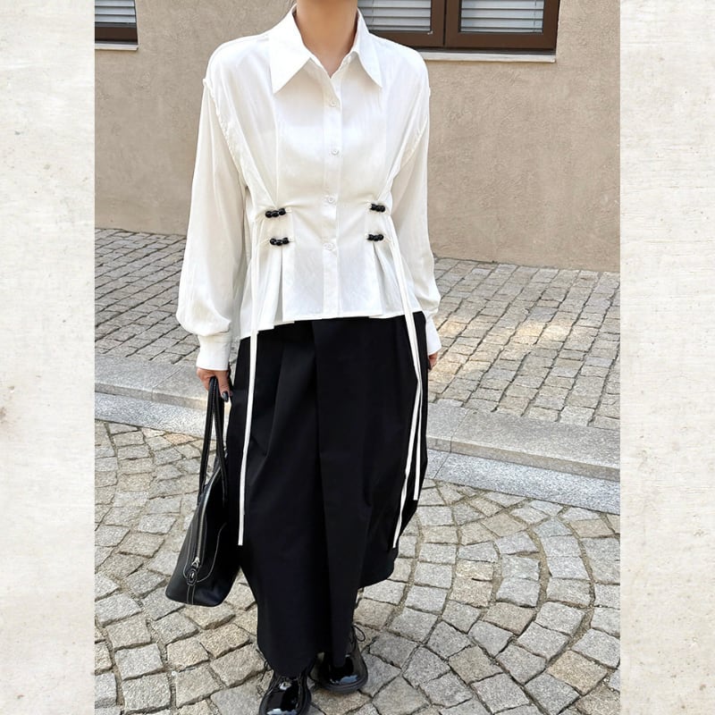 立体的なシェイプ部分に施された装飾が、ミニマルな白シャツにモードなアクセントと独創的なリズムを添えます。