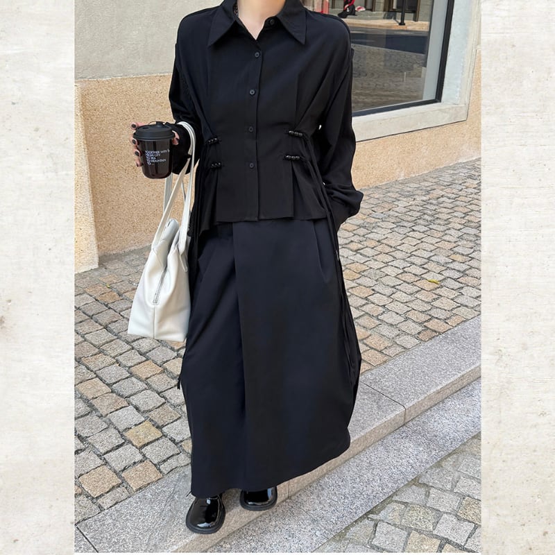 ウエストを鮮やかに彩る、黒いビーズと長く垂れるストリングが印象的な一枚。