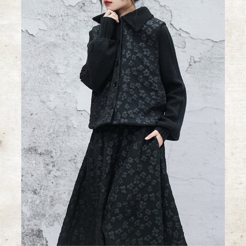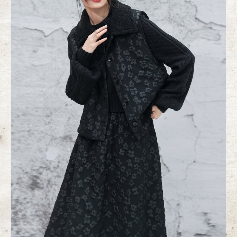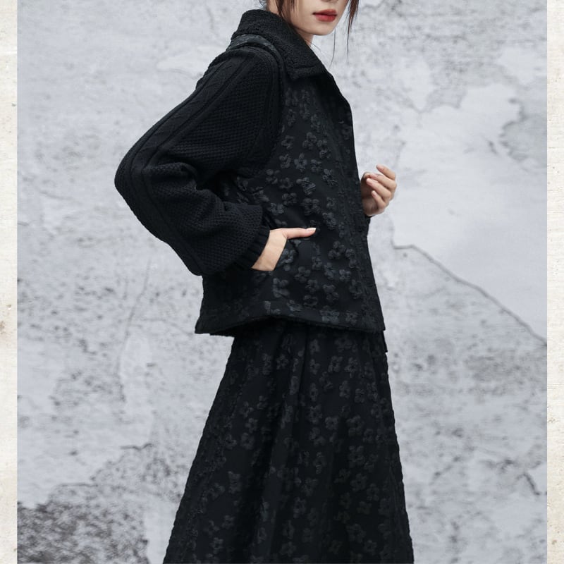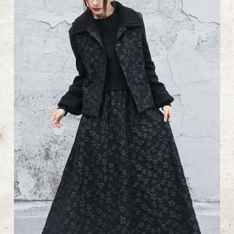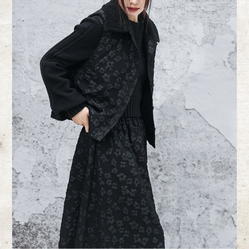 立体的なバブルジャガードの表情が、ダークな甘さを引き立てる一着。