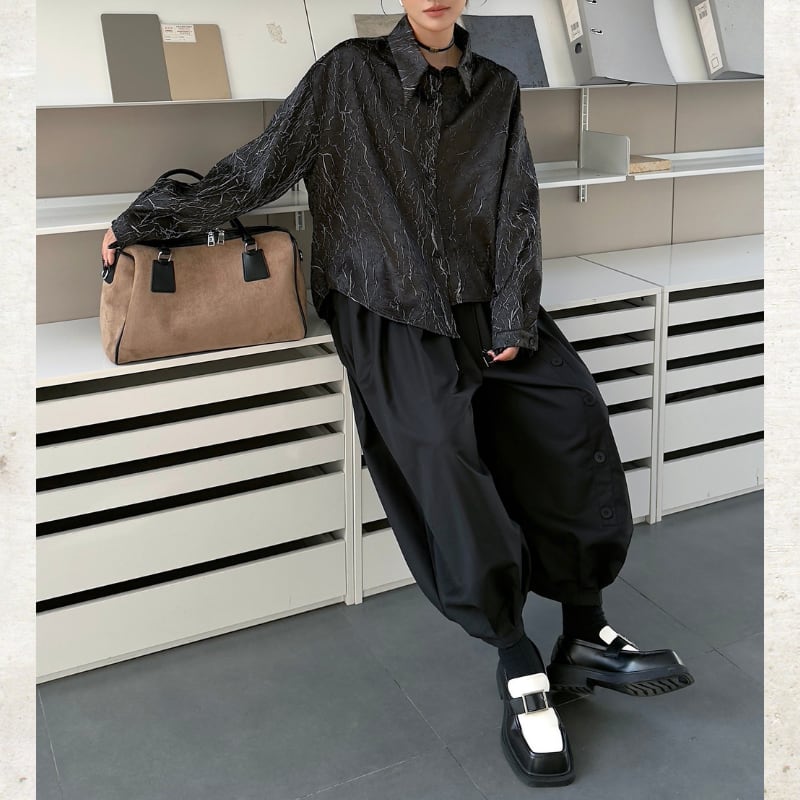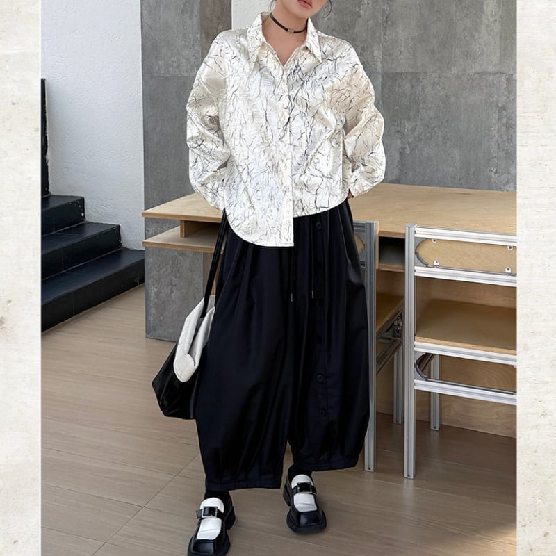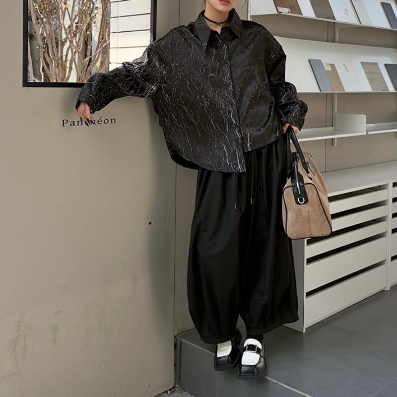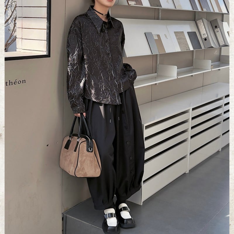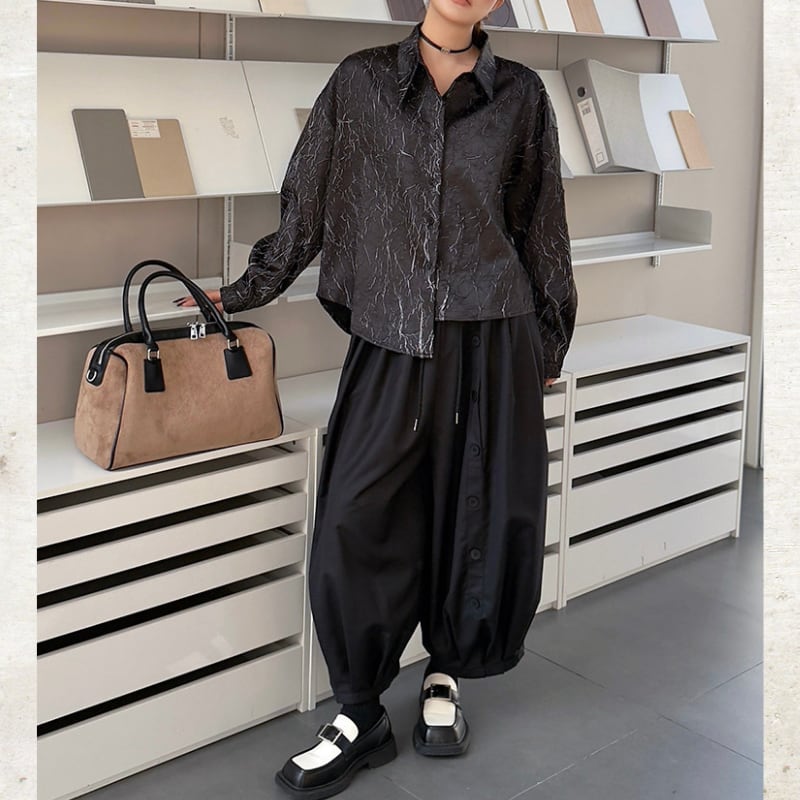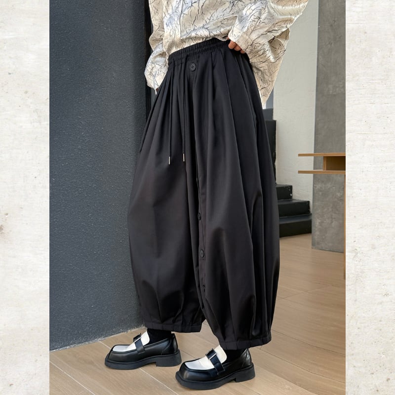 フロントに配された整然たるボタンディテールが、独創的なリズムを刻むランタンパンツ。