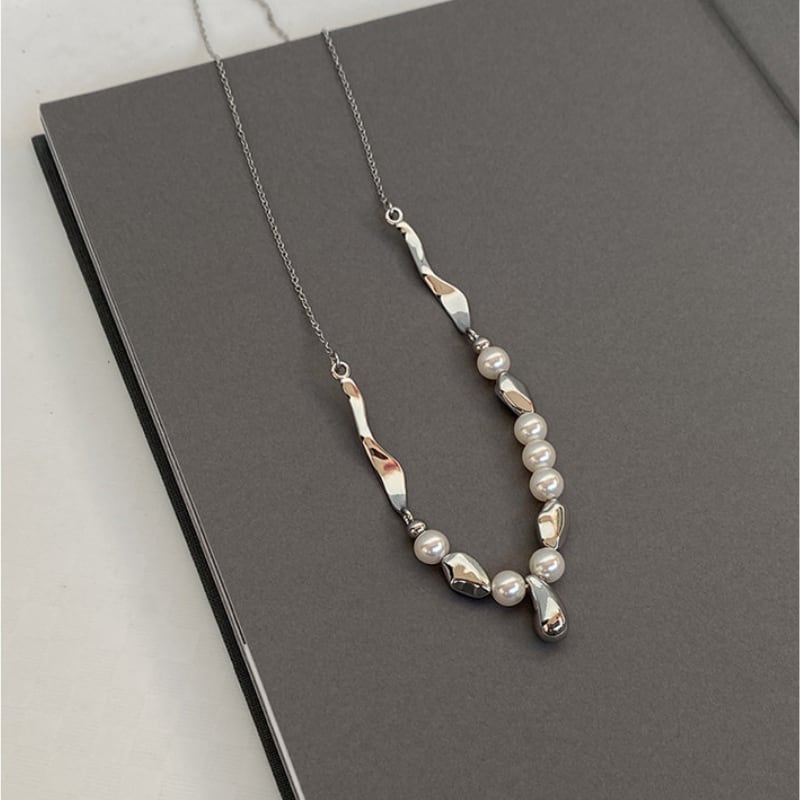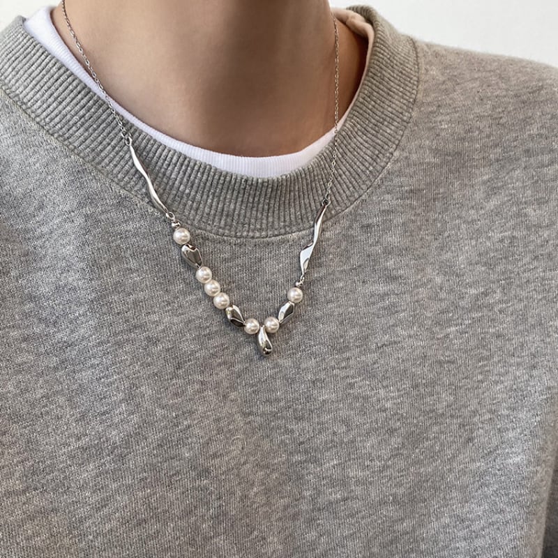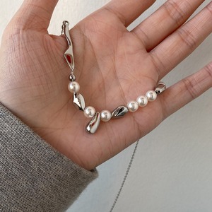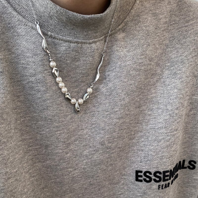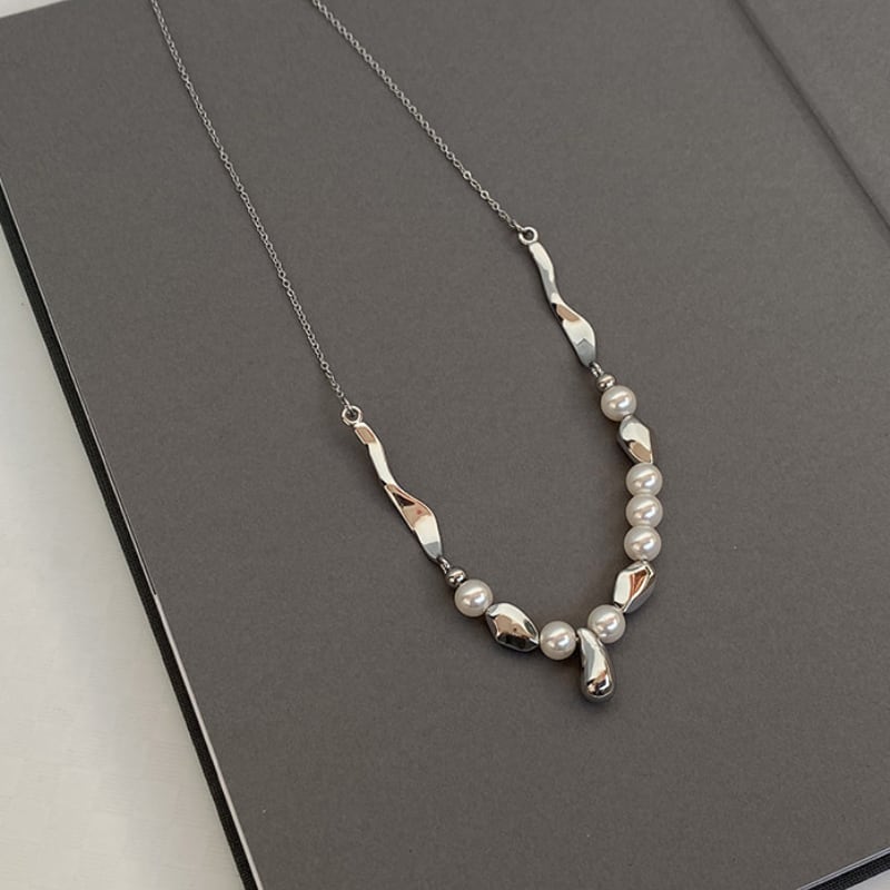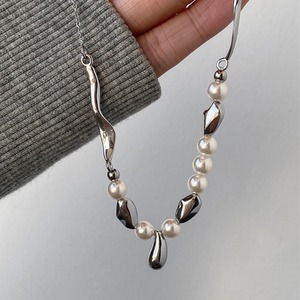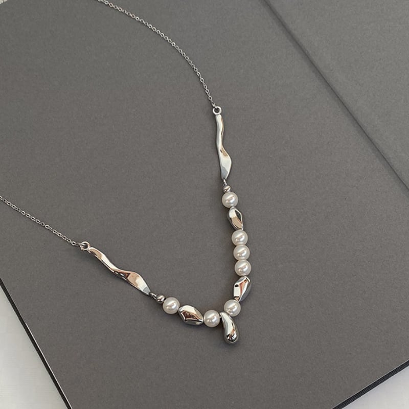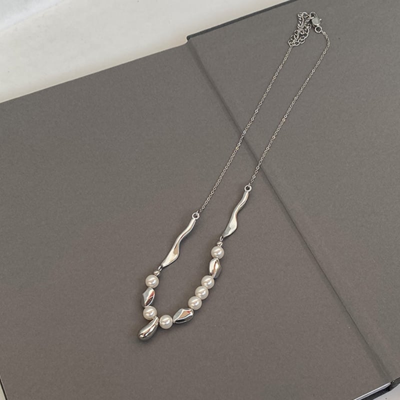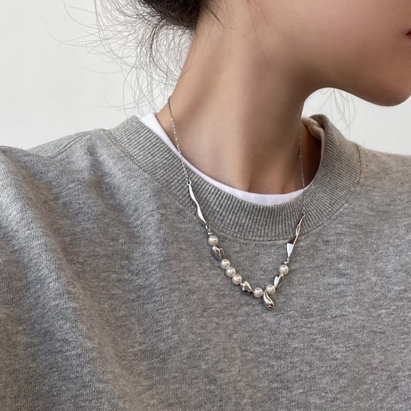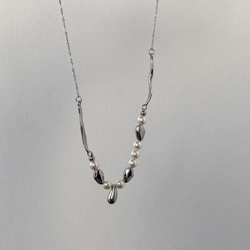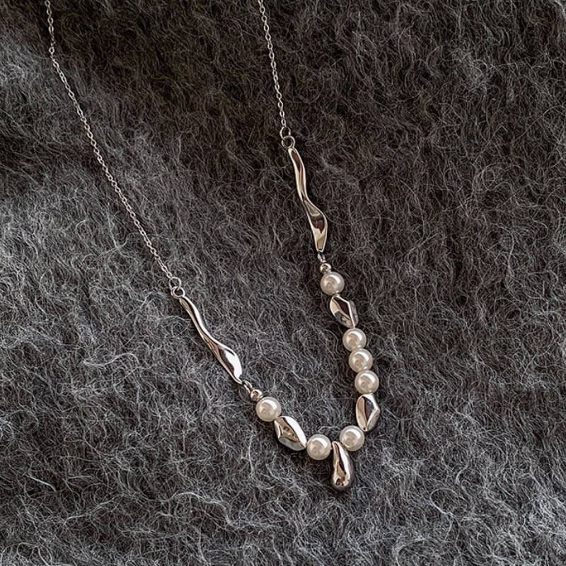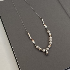溶け出した金属のような有機的なフォルムと、艶やかなパールの光沢が共鳴するデザインネックレス。